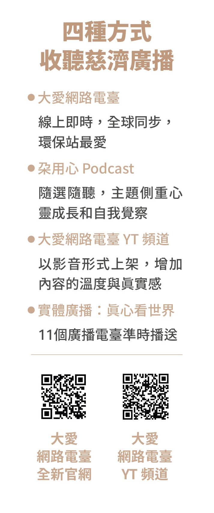 因應慈濟廣播四十周年,同時也是大愛網路電臺二十歲,在二○二五年九月誕生了全新的大愛網路電臺網頁―無論是喜歡用實體電臺收聽《真心看世界》節目,或是透過網路收聽的大愛網路電臺,就如有些慈濟環保站直接連結播出;還有可依個人時間選聽,自我成長類的「朵用心」Podcast,全集合在這個全新官網。
