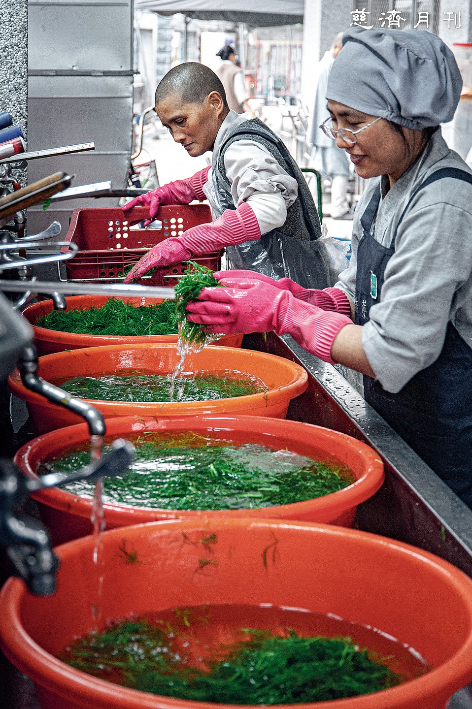 如果多用一點心,還可以發現師父的惜福精神。有些食材氧化變黑,師父薄薄削去表層,不願浪費。所有食物擺盤前,都要考慮大眾入口的方便性,這是一分利益他人的細心。餐桌上四菜一湯的料理,得來都不易;每喝一口湯、吃一口菜,都要很感恩背後每一個環節的付出。