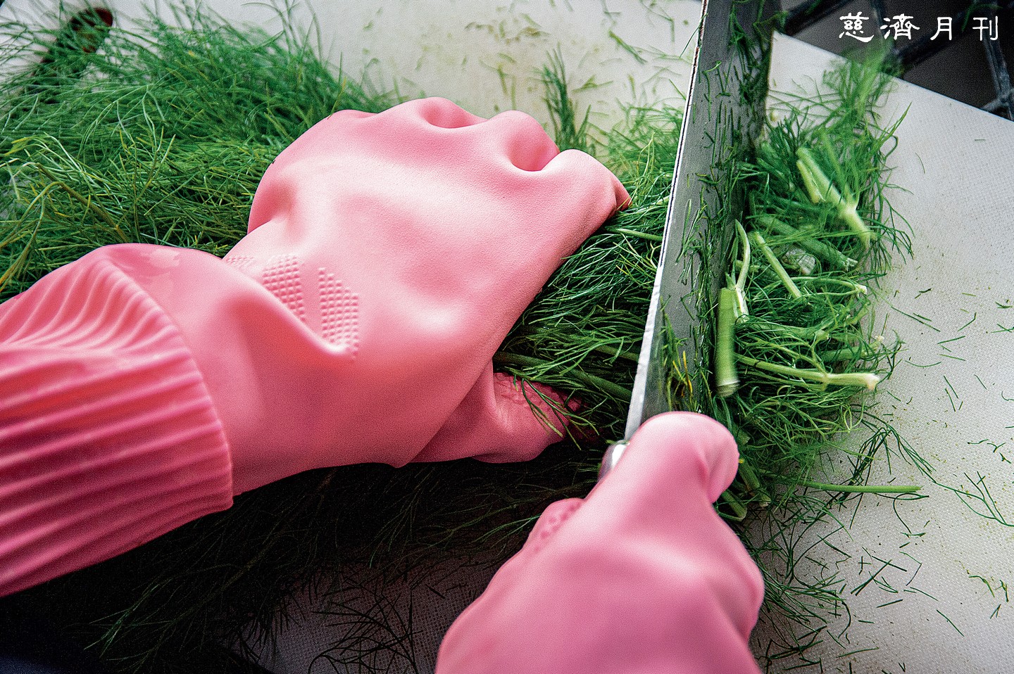 於我而言,除了學習師父做事的方法,也能看到少見的食材。例如在高麗菜盛產時,為了照顧農民,精舍大量採購曬成菜乾或醃製成酸菜,再冷凍起來;待菜價貴的時候,就可以拿出來使用。我們將高麗菜酸菜的菜葉撕成小片再切細絲,將水分擠壓出來;看似簡單,卻很辛苦,因為擠到手都跟酸菜一樣痠了。還有一次,師父拿來一小鍋醃製過的大橄欖,切開後,裏面的橄欖籽長著軟刺,橄欖肉愈厚,籽也愈大,愈難剝除。但這酸酸的橄欖,可以用來當湯底。