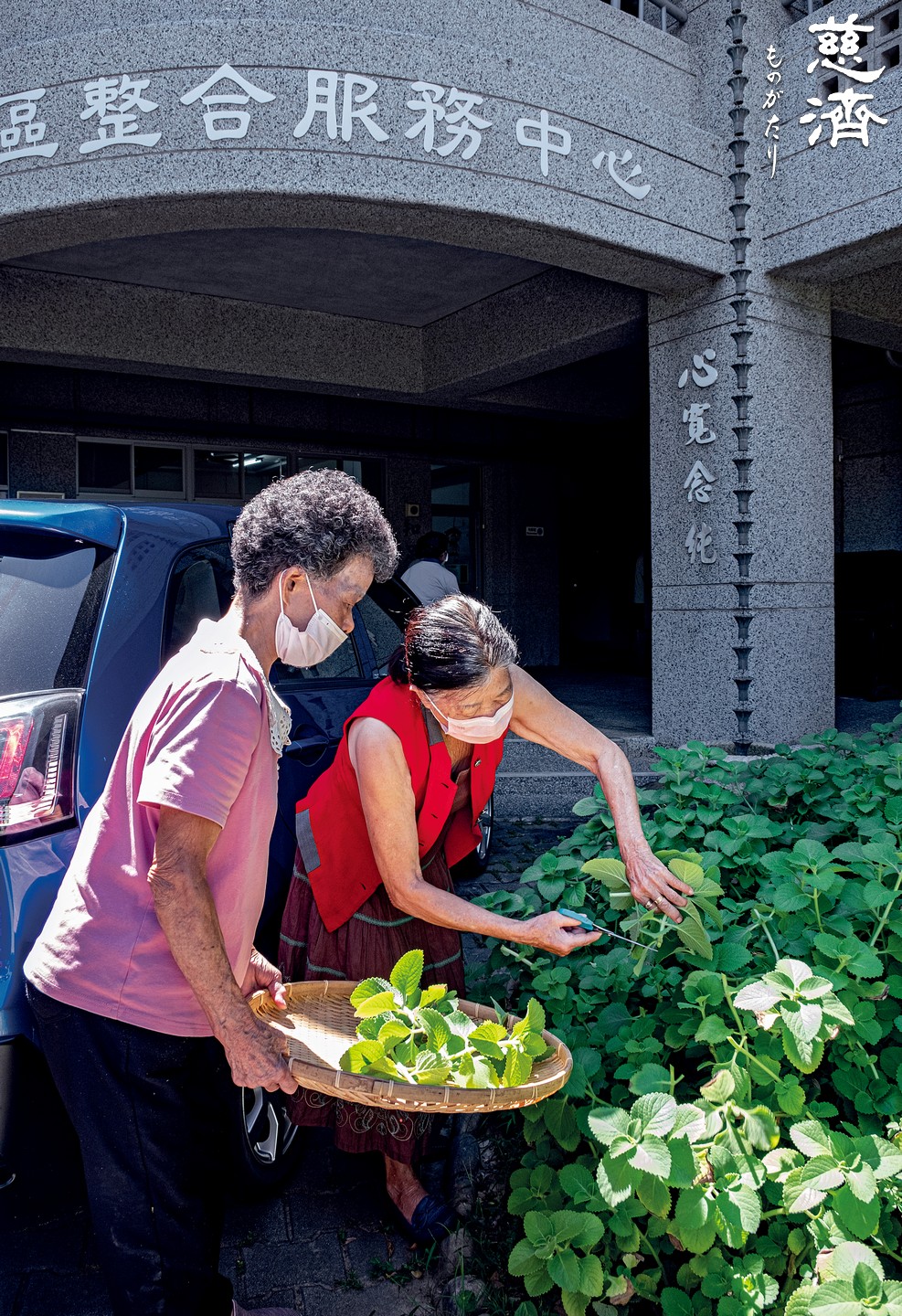 台中清水静思堂前の木陰で、高齢者たちが歩行器を使ったり、車椅子に座ったりしていたが、移動する間も介護スタッフがそばで世話をしていた。「次はあなたが切る番よ!」と介護スタッフの陳碧玉(チェン・ビーユー)さんが一人の男性利用者にハサミを手渡した。彼はアロマティカスを採取する動作をリハビリとして行っていた。その七十歳未満の男性は、慈済清水デイケアセンターに通っている三十数人の利用者の中では最も若い。脳卒中による片麻痺があったが、退院後に静思堂に来て、デイケアセンターの日々のプログラムと活動に参加してきたことで、体の状態は大きく改善した。