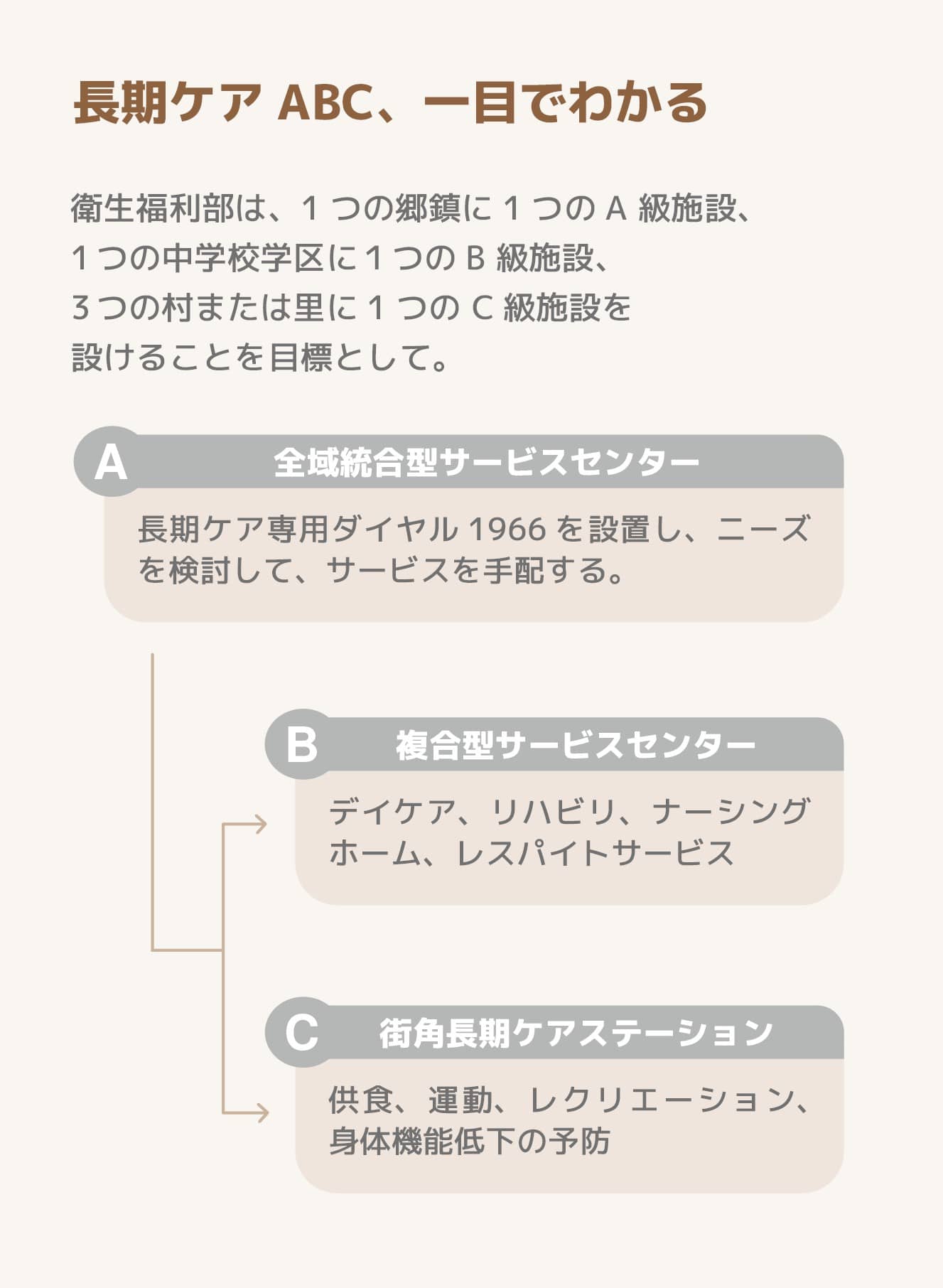 今の高齢者と将来の高齢者を適切にケアするために、政府は二〇〇七年に「長期ケア十年計画(長照一・〇)」を展開し、二〇一七年には現行の介護施策である「長期ケア二・〇」を導入した。対象者を拡大しただけでなく、より重要なのは「ABC全域型介護モデル」を確立し、介護資源を三段階に分け、申請の受理からサービスの提供まで、できる限り、高齢者が慣れ親しんだ環境を離れることなく、支援を受けられるようにしたことである。