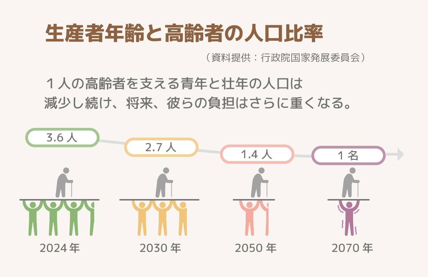 国家発展委員会が発表した人口推計によると、二〇三九年、台湾の高齢者人口の割合は三割を突破し、二〇五九年には四割を超えるという。さらに、今は若年、壮年層の未婚、無子比率が高いため、将来高齢期を迎えた時には家族の介護に頼ることができないという問題に直面することになる。