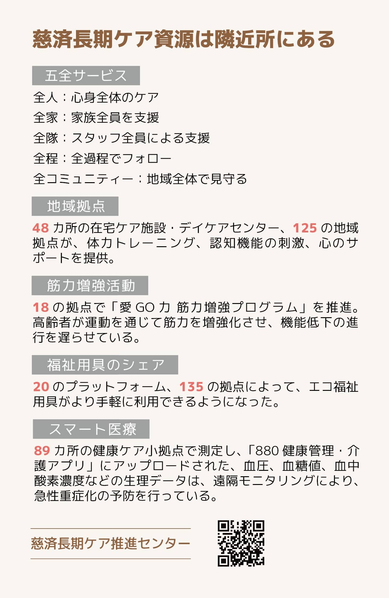 高齢者が住まいの近くに外出し、社会的な交流を増やせるように、慈済の長期ケア系統は、台湾全土に百二十五の地域ケア拠点を設けている。これらの拠点は住いの近くにある慈済会所やリサイクルステーションにあり、同時に政府が推進する健康診断や運動などの予防的な健康増進策と連携している。また蓄積されたビッグデータを活用することで、リスクの高い層を特定し、優先的に支援を行うことも可能である。