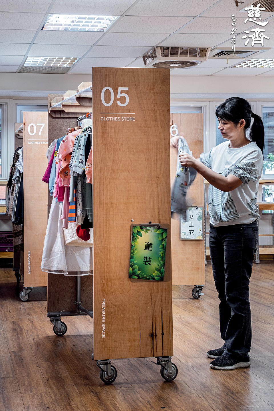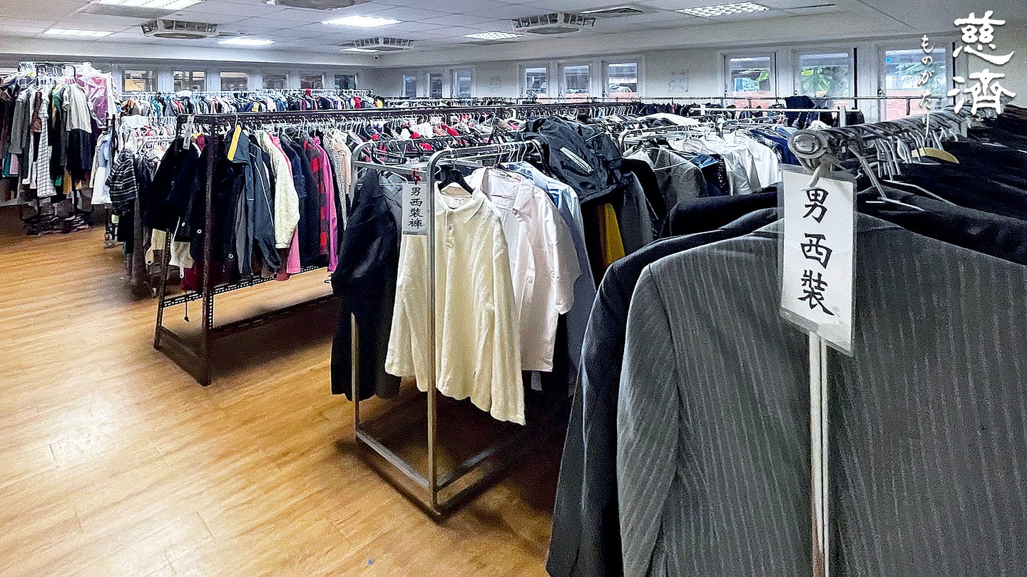 設計と改造を経て、衣料品コーナーには七台の移動収納棚が設置され、様々な種類の衣料品が分類して掛けてあり、衣料品で溢れかえっているにもかかわらず、じっくりと選ぶスペースを確保している。収納棚にはキャスターが付いているので、移動がとても便利だ。スペースを有効に使えると同時に、高齢ボランティアへの配慮も感じられる。