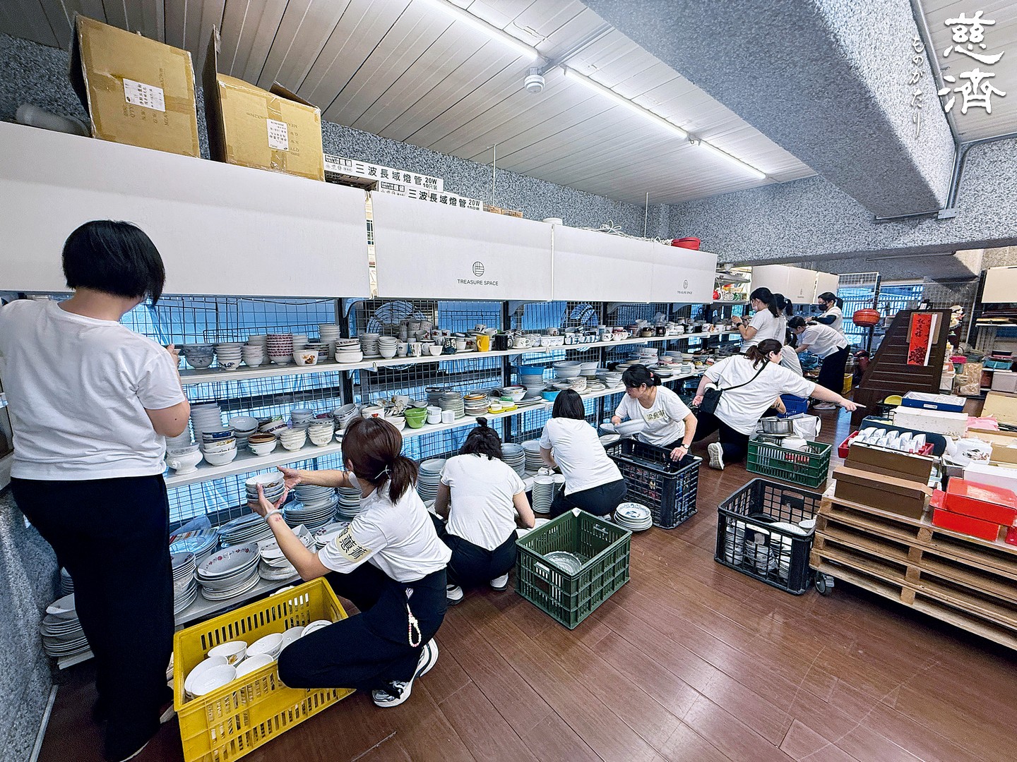 「収納する幸せ」の30数人の実習コンサルタントは、8月中旬に整理実践クラスに参加し、惜金エリアで中古の食器を整理した。(撮影・許雅玲)