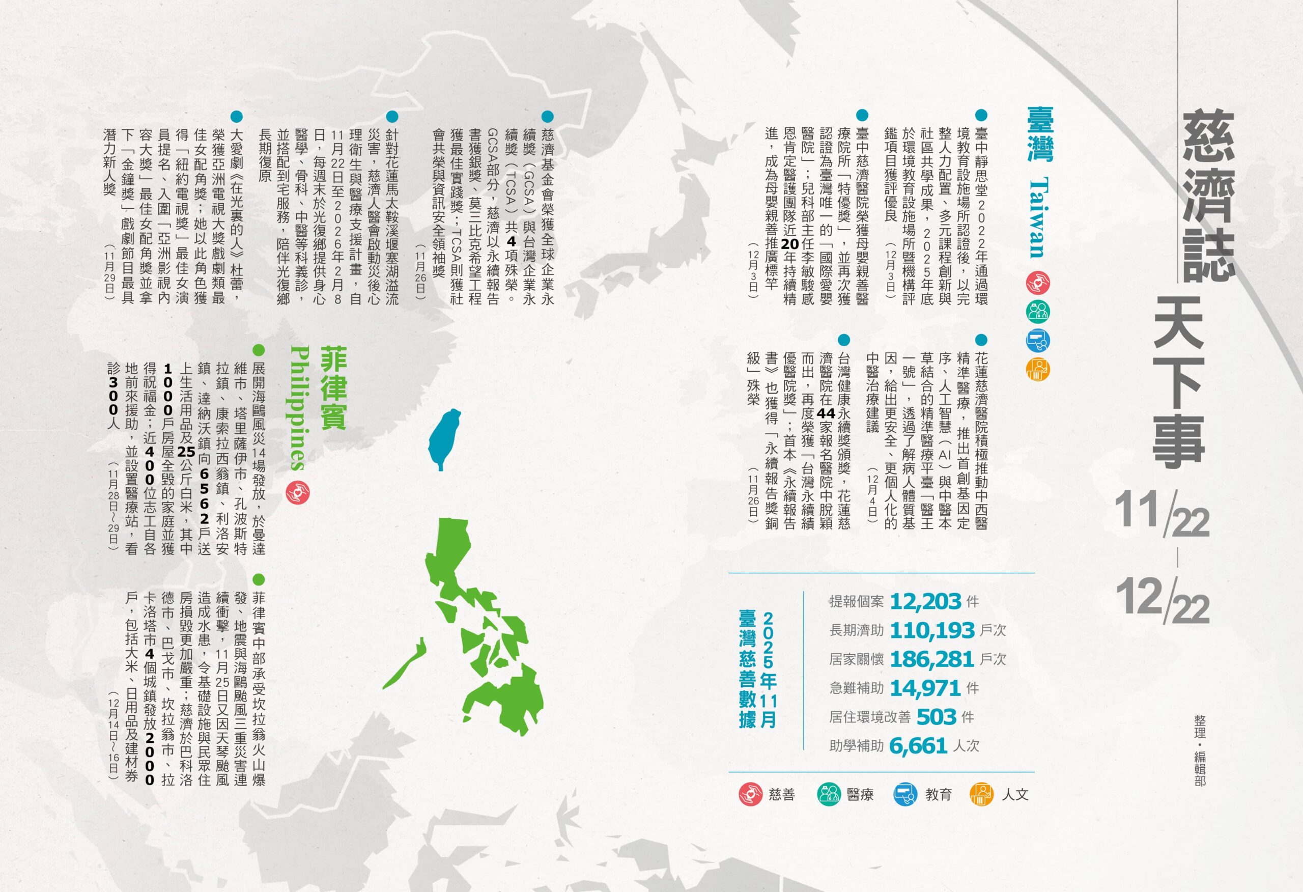 • 慈濟基金會榮獲全球企業永續獎(GCSA)與台灣企業永續獎(TCSA)共4項殊榮。GCSA部分,慈濟以永續報告書獲銀獎、莫三比克希望工程獲最佳實踐獎;TCSA則獲社會共榮與資訊安全領袖獎(11月26日)