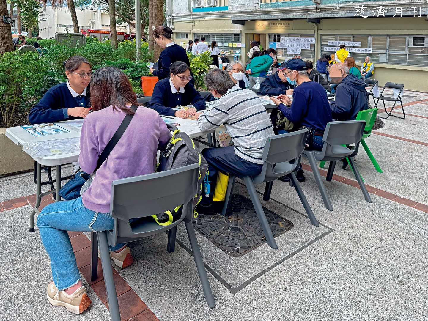 志工十一月二十七日上午再次來到宏福苑外圍,關懷受到影響的居民(圖1)。志工展開慰問金發放登記造冊,不只是應急補助,更想膚慰受災戶的驚恐失落(圖2)。(圖1/牟晏瑩攝影 圖2/姚加偉攝影)