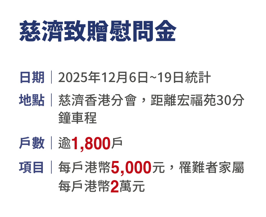 一千九百戶受災害波及,慈濟援助超過九成;這也是香港分會成立三十二年來最大型的災難發放。執行長施頌鈴說,這筆現金是臨時應急,「心理創傷的復原,是一條很長遠的路;希望我們有因緣可以陪伴他們,走過這段艱難的日子。」