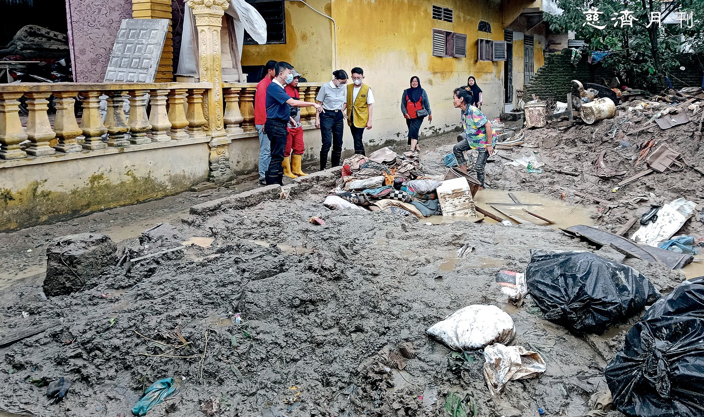 慈濟成立三十多個公共廚房,數千份便當在簡單的環境下產出;志工們涉水穿過及腰的泥流,將熱食、白米與礦泉水送出。巴霧村(Kampung Baru)六十四歲的努萊妮(Nuraini),帶著孫子蜷縮在清真寺的角落;過去三天,他們沒有吃過一頓正餐,僅靠著鄰居搶救出來的一點麵包果腹。當志工遞上一盒溫熱的飯菜時,這位堅強的祖母聲音顫抖著:「非常感謝。沒有水也沒有電,電線短路,所有設施都倒了,根本無法回家……」