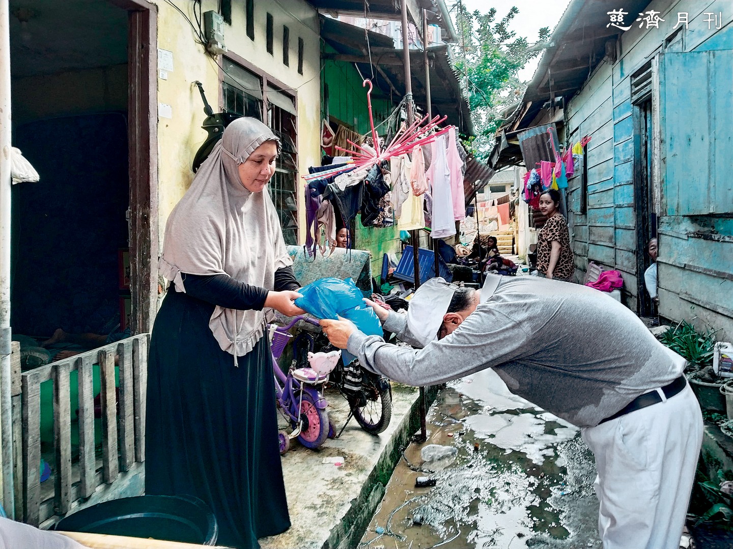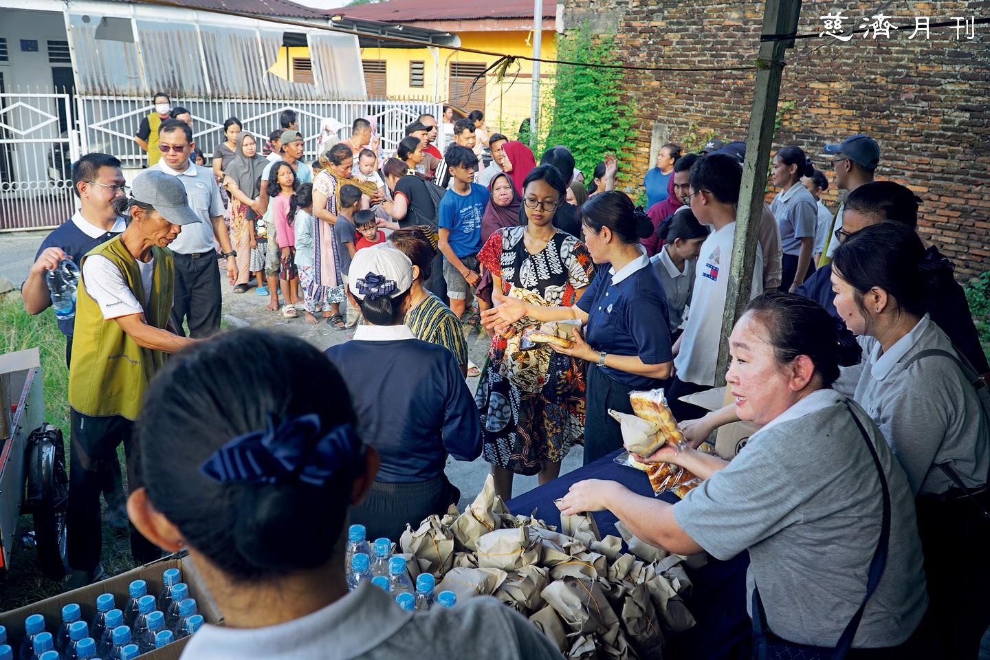 紗籠、衣物、清掃工具等物資,由志工分頭送往棉蘭市區與日里雪冷縣(Deli Serdang)、丹戎穆利亞鄉(Tanjung Mulia)等周邊地區。在日里雪冷縣克倫邦村(Klumpang Kebun),當慈濟的物資車隊抵達時,許多居民站在水中排隊,接力搬運物資。一位年輕母親接過熱食時,眼眶瞬間紅了;她告訴志工,因為糧食耗盡,一家人兩天沒有吃東西。「感恩真主阿拉,終於有人來幫助我們!」