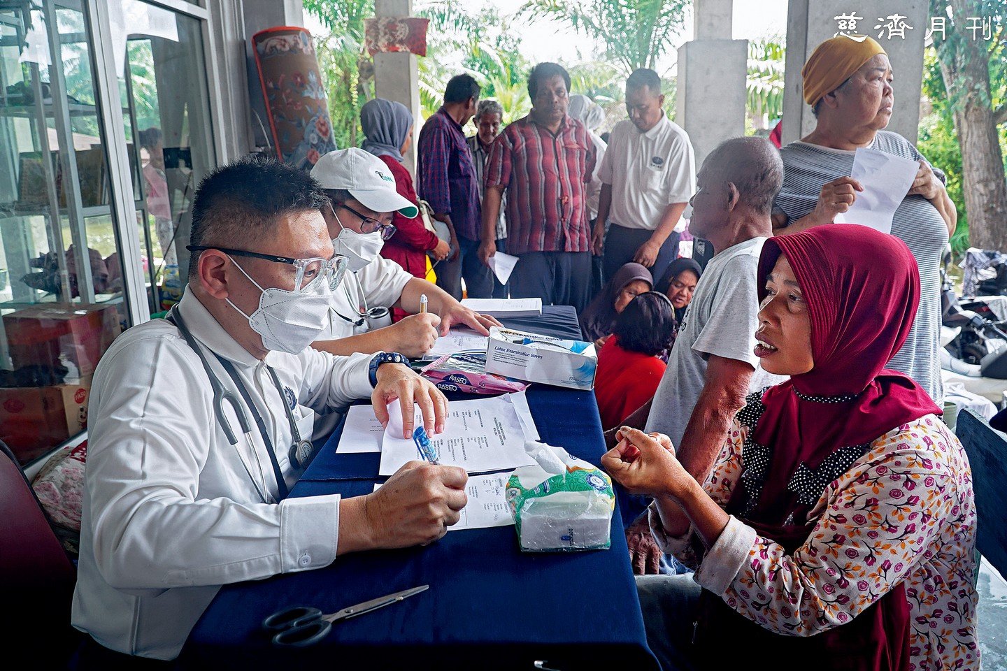 慈濟人醫會醫師海利(Hari Kesumua)為長者檢查身體,開立腹瀉、皮膚癢等藥物,「他們失去家園,也非常需要食物與藥物;災情真的相當嚴重,很感恩能幫他們減輕一點負擔。」