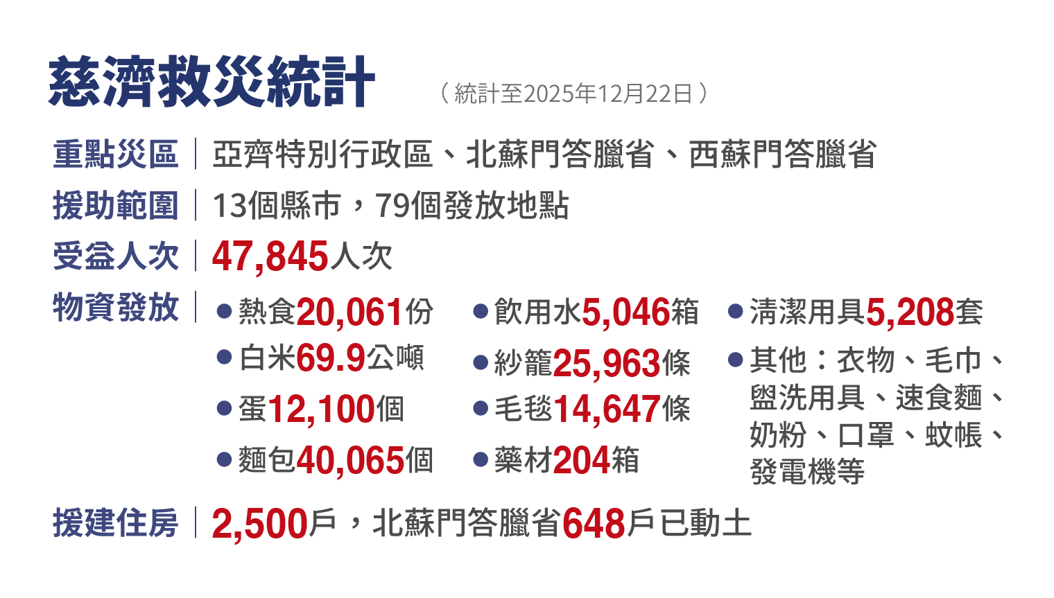 棉蘭、直民丁宜(Tebing Tinggi)、巴東(Padang)、亞齊志工持續救災,協助成立避難所及公共廚房、設置水塔提供乾淨飲水。直到十二月中旬,災區景象依然令人觸目驚心。在亞齊塔米昂縣(Aceh Tamiang)的卡朗‧巴魯村(Karang Baru),洪水退去後留下的痕跡彷彿超現實畫作—汽車被沖起掛在圍牆上,街道被厚達數十公分的淤泥覆蓋,重型機具山貓與推土機正在轟鳴清理。許多收容所的人們身上仍帶著泥印,因為無水可洗。