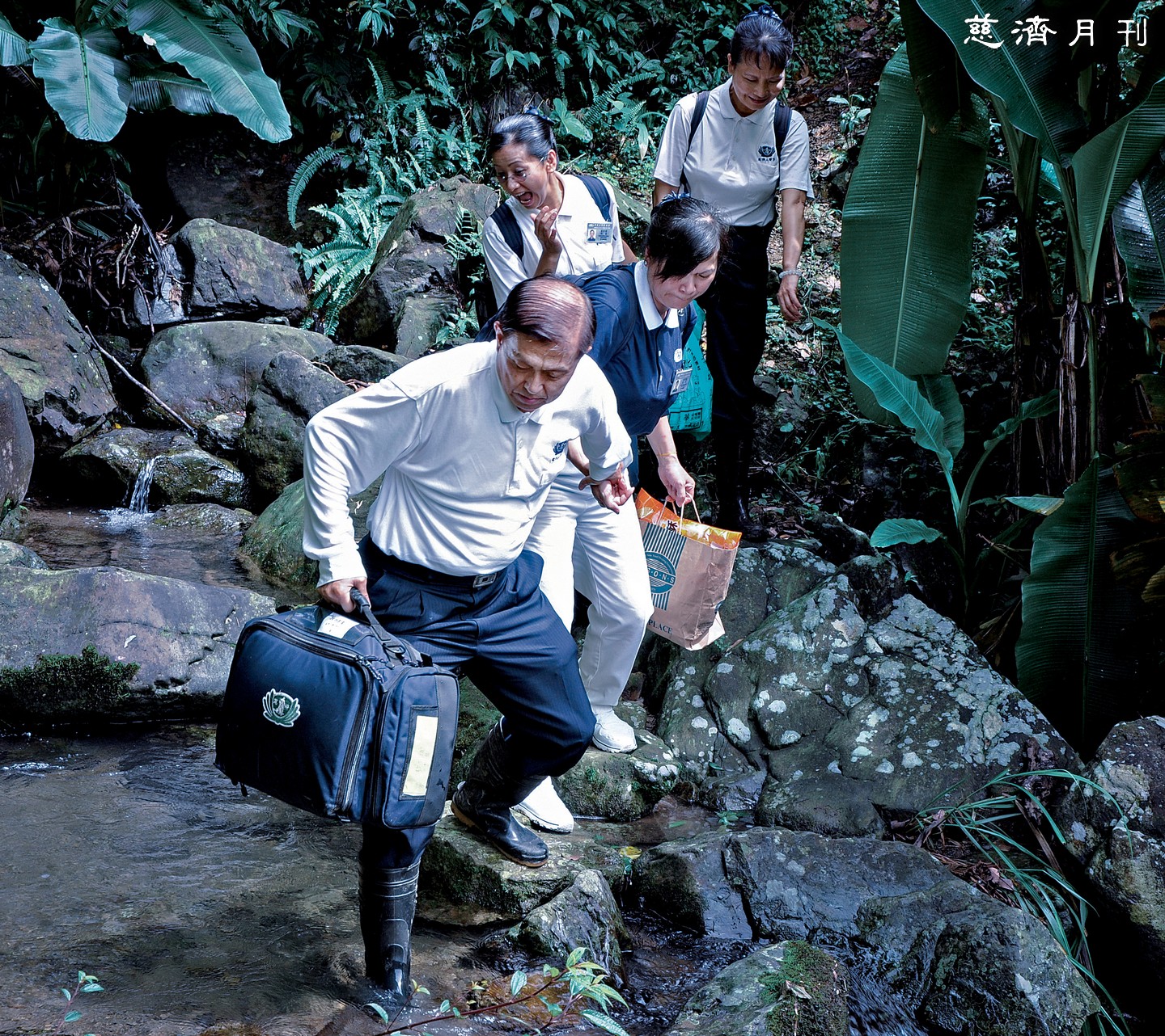 二〇一四年於雙溪,邱鴻基醫師(由前至後)、志工張秀蘭、與護理師彭秀靜、馬麗香跋山涉水徒步五十分鐘,終於來到獨居山上的阿蓮阿公住處看診。(攝影/劉振江)