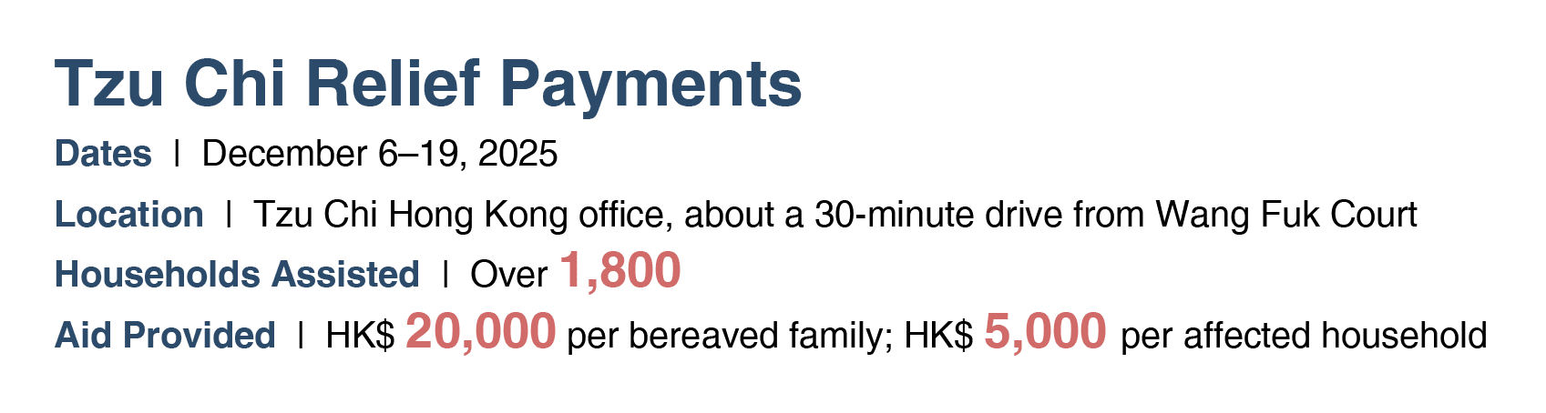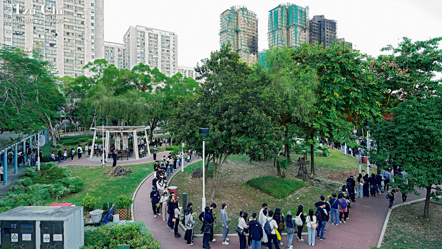 On November 29, volunteers sent out messages announcing that relief payments—20,000 Hong Kong dollars for each bereaved family and 5,000 for each affected household—would be distributed on December 6 and 7 at the Tzu Chi Hong Kong office in Kowloon Tong. Free medical consultations for affected residents and frontline rescue personnel were also started that day at the Tzu Chi Great Love Chinese Medicine Clinic on Nathan Road in Yau Ma Tei; these services continued through December 31.