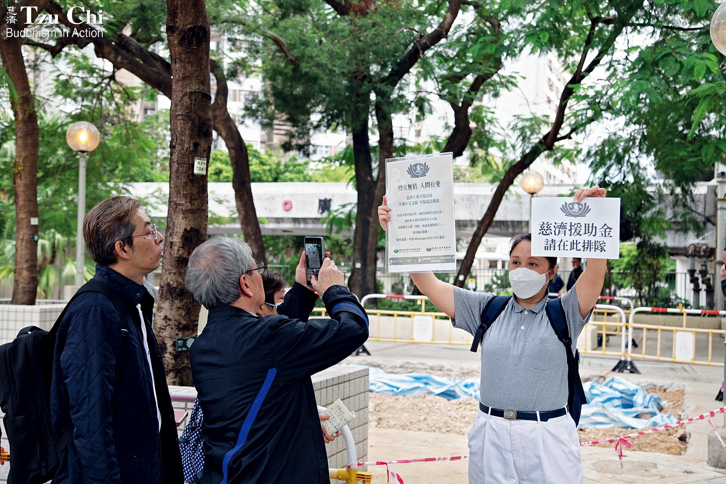 Following the disaster, the government made Fung Leung Kit Memorial Secondary School, near the fire scene, available as a temporary center for evacuation and subsidy applications. Access was restricted to affected residents, so Tzu Chi volunteers stationed themselves under a tree outside, standing as they registered residents for relief payments. One passerby, noticing the volunteers on their feet and moved by their dedication, guided them to a space upstairs and provided two tables for their work. Government care team members also assisted by directing residents to the Tzu Chi registration area to complete their forms.