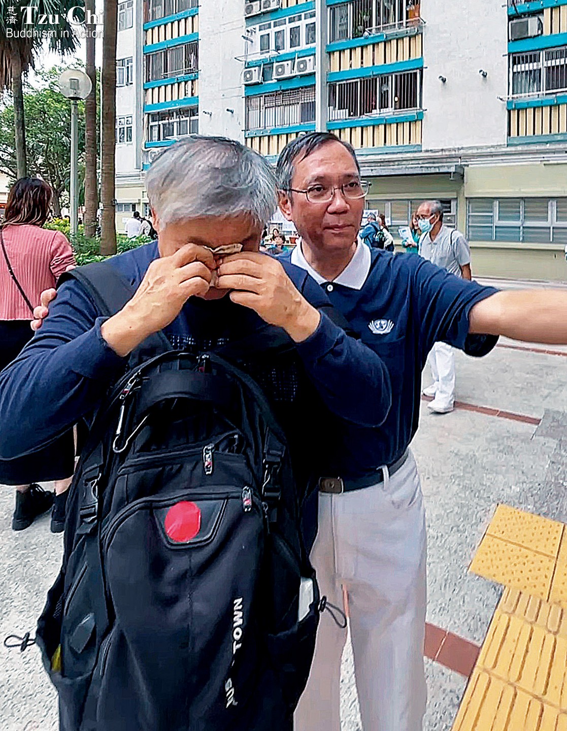 A volunteer stands beside a resident shaken by the fire, placing a reassuring hand on his shoulder. Tzu Chi distributed relief payments after the blaze to not only meet urgent needs but also offer emotional comfort. Yiu Ga Wai