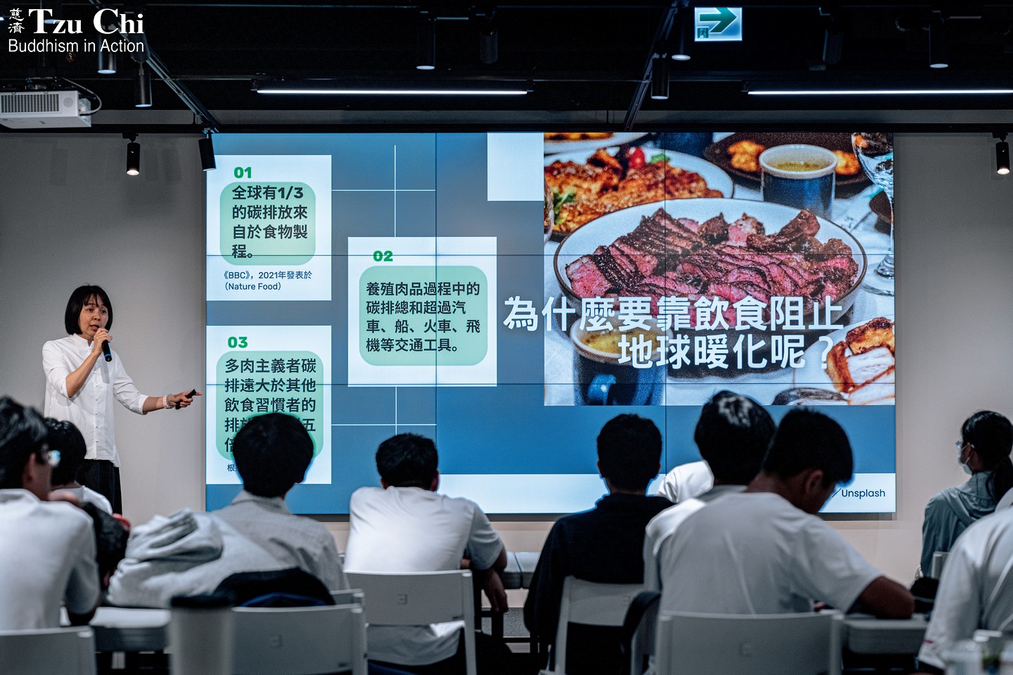 “There are over a billion cows in the world,” explained volunteer Guo Mei-jun (郭玫君) during one such event. “If they formed a country, it would be the second-largest emitter of carbon dioxide.” She went on to share several eye-opening figures: Eliminating meat for just one meal can cut carbon emissions by about 780 grams, and eating 15 vegetarian meals cuts emissions by roughly 12 kilograms—the amount a mature tree absorbs in a year.