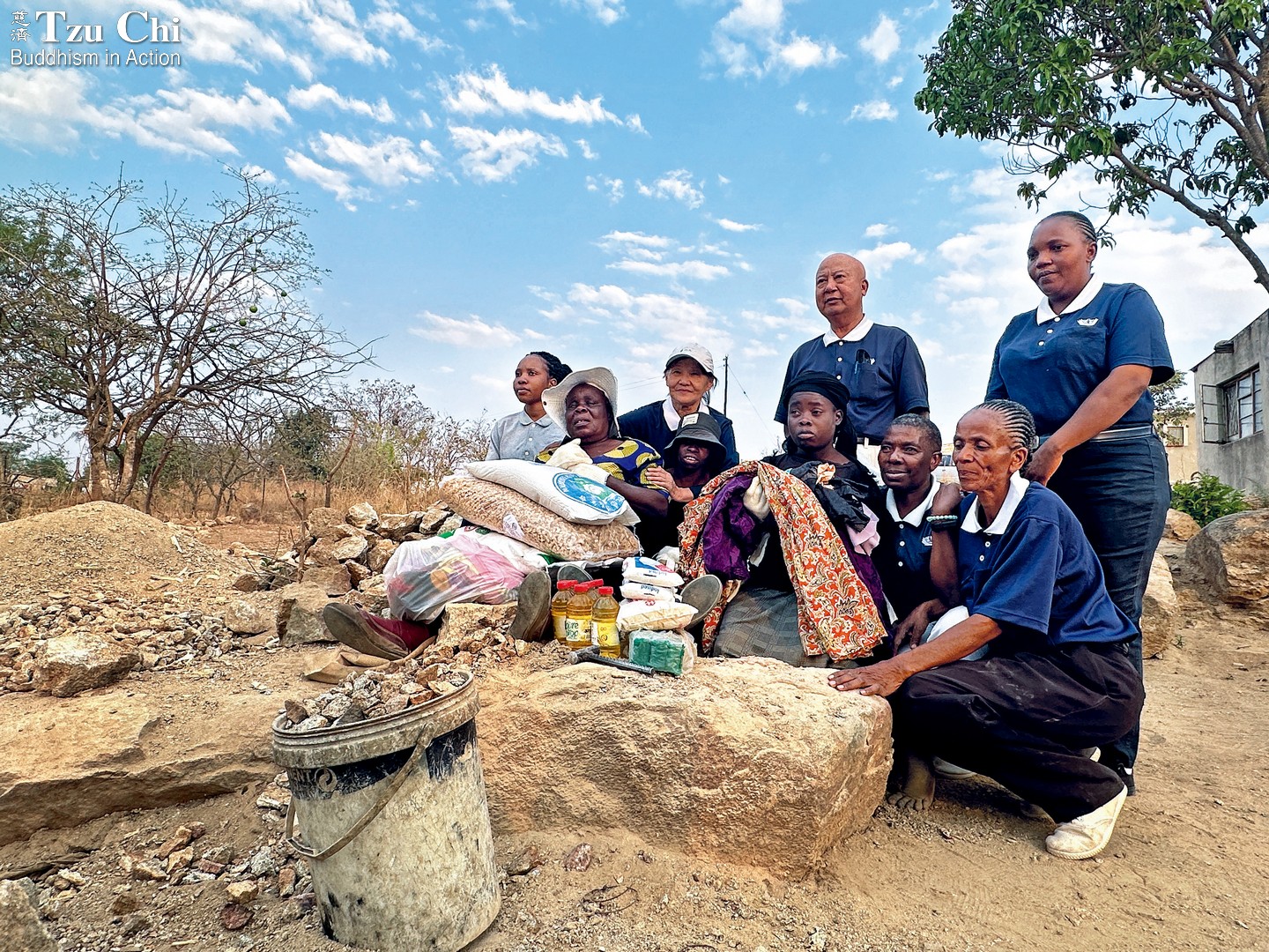 Tino Chu (center), his wife, Li Zhao-qin (third from left), and other Tzu Chi volunteers pose with a family in Domboshava—a blind grandmother and her grandchildren—during a visit to deliver supplies and offer emotional support.