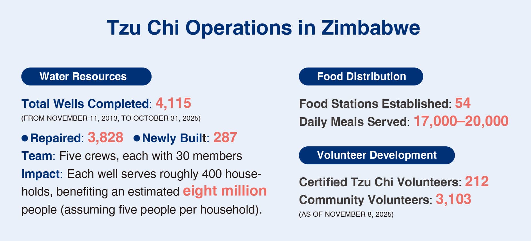 In early October 2025, shortly after I returned to Taiwan from Zimbabwe, Chu shared some exciting news: Tzu Chi’s well-drilling team in Zimbabwe had received official recognition from the central government. From now on, drilling or repairing wells in rural areas would be much smoother, as communicating with local authorities would be easier. “We should be able to reach our goal of drilling or repairing 5,000 wells by the end of 2026,” he said. “We’ll be ahead of schedule!”