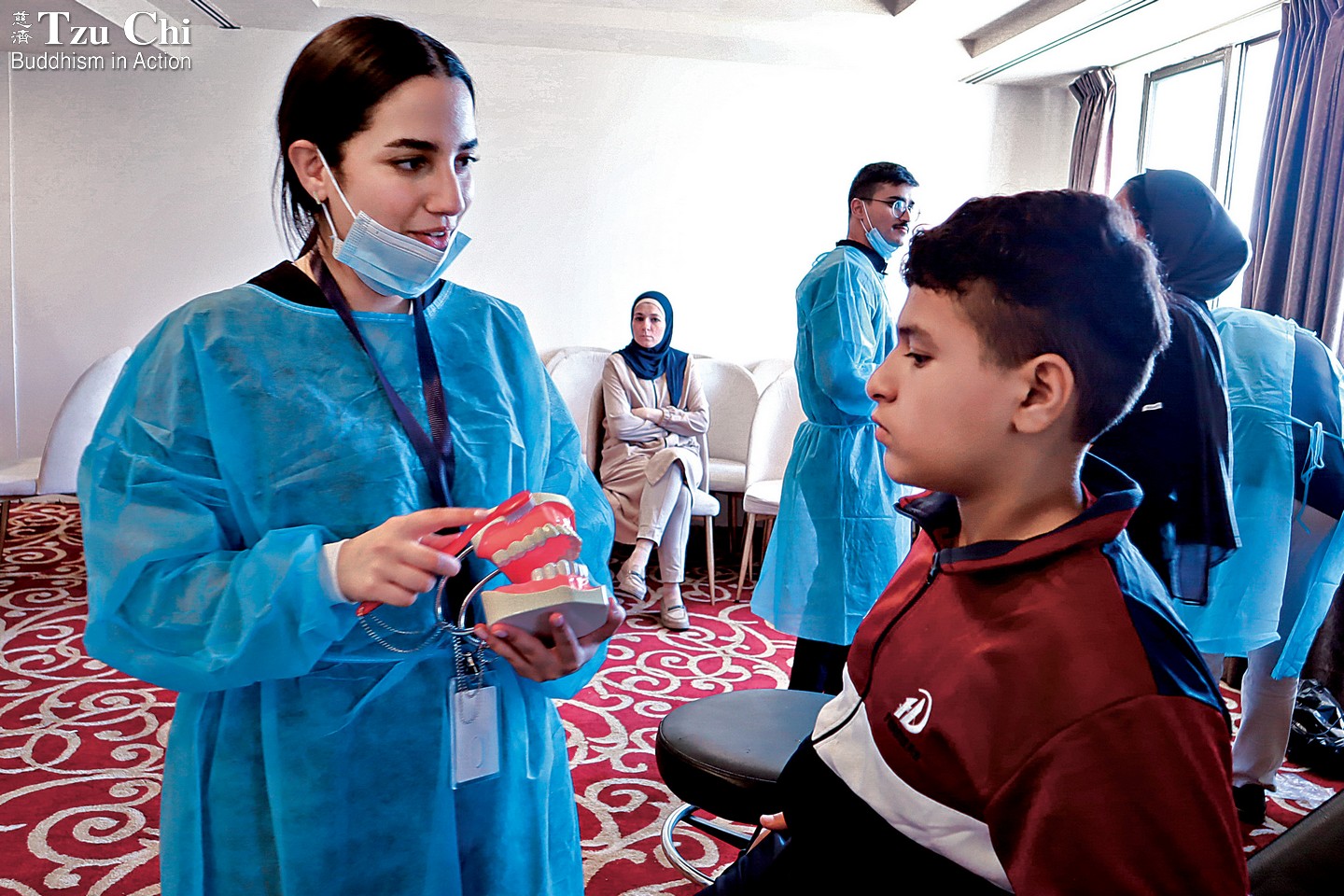 A volunteer provides oral health education to a child from Gaza at the free dental event held by Tzu Chi in Amman, Jordan, in October 2025.