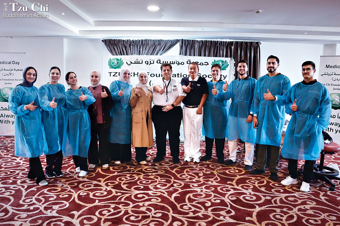 Dental professionals from the Tzu Chi International Medical Association and other Tzu Chi volunteers, including Syrian refugees, pose with thumbs up at the dental event, showing their enthusiasm to serve.