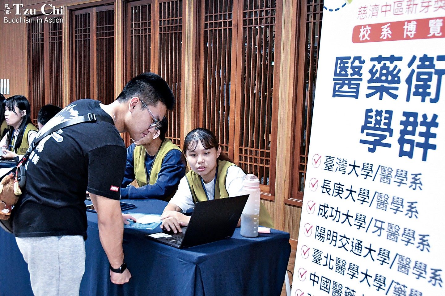A college fair was held at the Taichung Jing Si Hall ceremony on November 1, where scholarship recipients—current college and master’s students, along with former recipients who have graduated—shared their schooling experiences with high school students and offered guidance on choosing a college major. Lin Qi-wei (林祺惟), from the Department of Electrical Engineering at the prestigious National Taiwan University, talked to interested students about what an electrical engineering program involves. “Tzu Chi’s care and financial support have made me who I am today,” he said. “I’m very happy to be here guiding the younger students. I hope my experiences and advice can help them avoid unnecessary detours.”