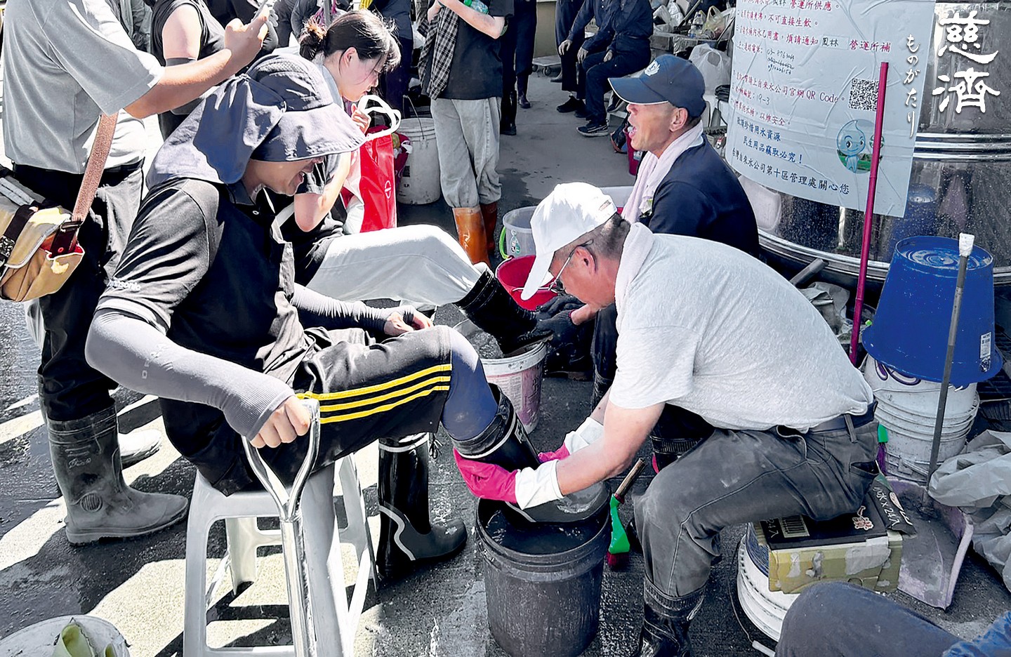 清掃作業を始めて数日間、何人かの慈済ボランティアが、作業を終えて電車に乗る前の人たちの長靴を洗っていた。その後、若い人たちによっていくつもの動線が整えられ、靴を洗い、全身に消毒液を噴霧し、最後に手指のアルコール消毒する、という一連の工程の流れが設計、システム化され、スムーズに行われた。