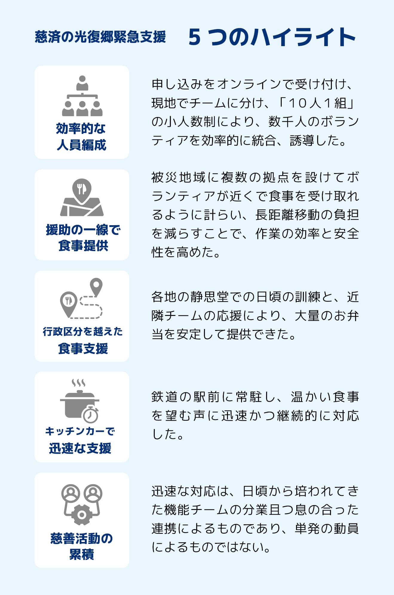 清掃活動、緊急医療支援、慰問金の配付、専門的な修繕といった慈済の災害支援は、段階的に進められると共に、他の団体とも協力して、日常生活を取り戻せるように被災者を助けた。