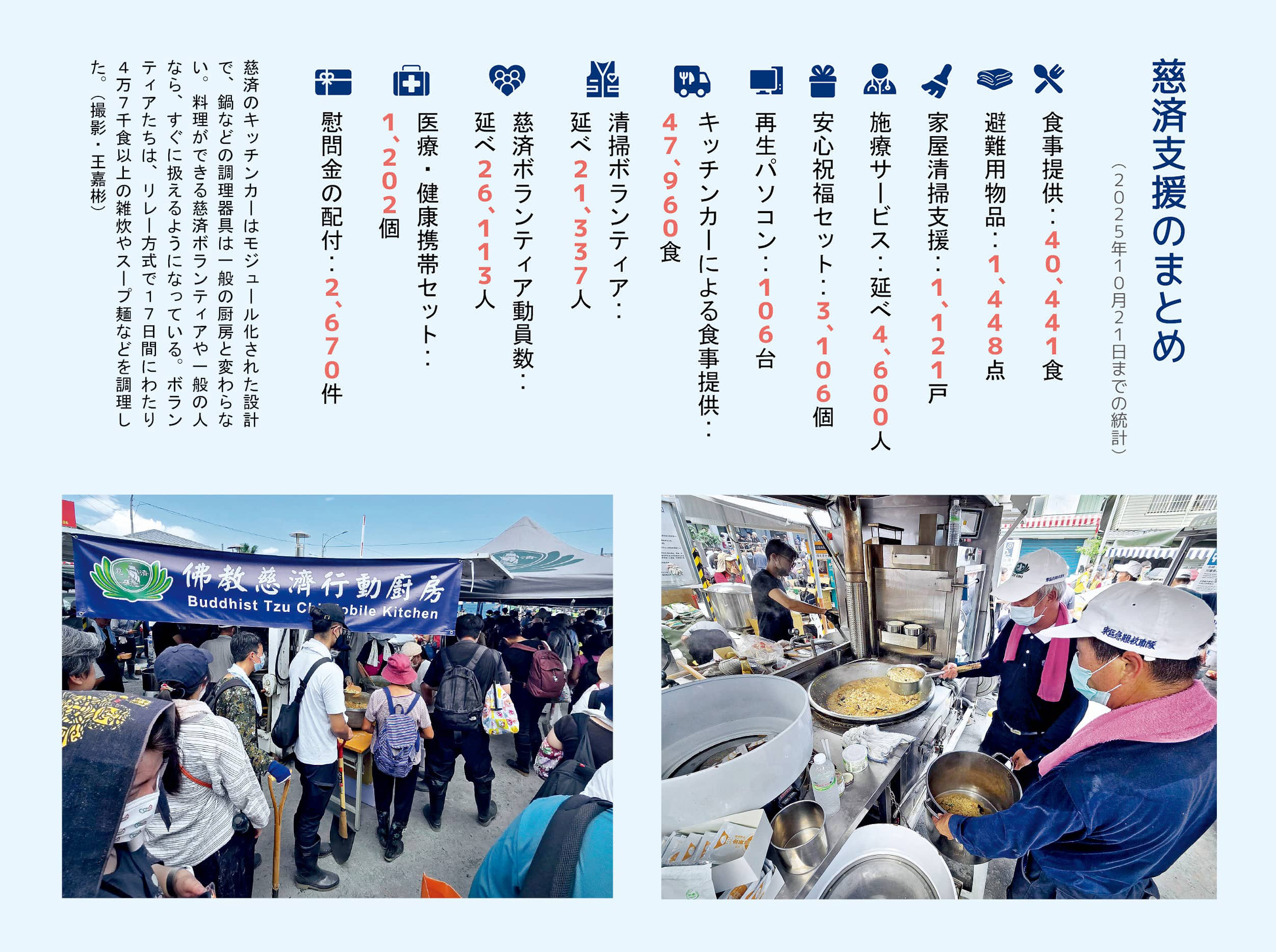 長年にわたり災害後の支援活動に携わってきた慈済ボランティアは、今回これほど多くの若者が参加した光景を見て驚き、そして新しい世代がこんなにも力を尽くしてくれる姿に胸を打たれた。これほど多くの人手と物資、そしてさまざまな組織や官民の協力があったからこそ、災害からの復旧が加速した。