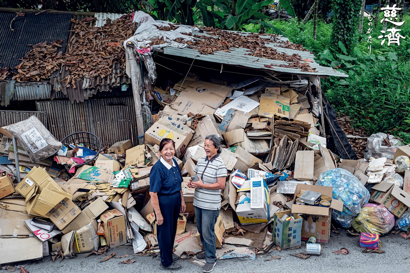 王秋豆さん(左)は、自宅の裏に慈済リサイクル拠点を立ち上げた。幸いにも汚泥被害に遭うことはなかった。災害後、王愛喜さん(右)と共に様々な支援活動に投入し、現在も整理されていない大量の回収物が置かれてあった。