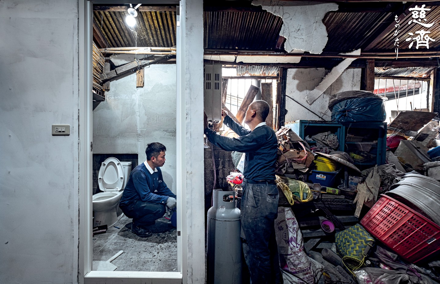 修繕ボランティアの高惟瑛さん(右)と陳維延さん(左)は修繕した家で湯沸かし器をテストしていた。10日間も経たないうちに、トイレの床タイルから壁までを磨き上げ、浄化槽、シャワー設備を次々と完成させた。
