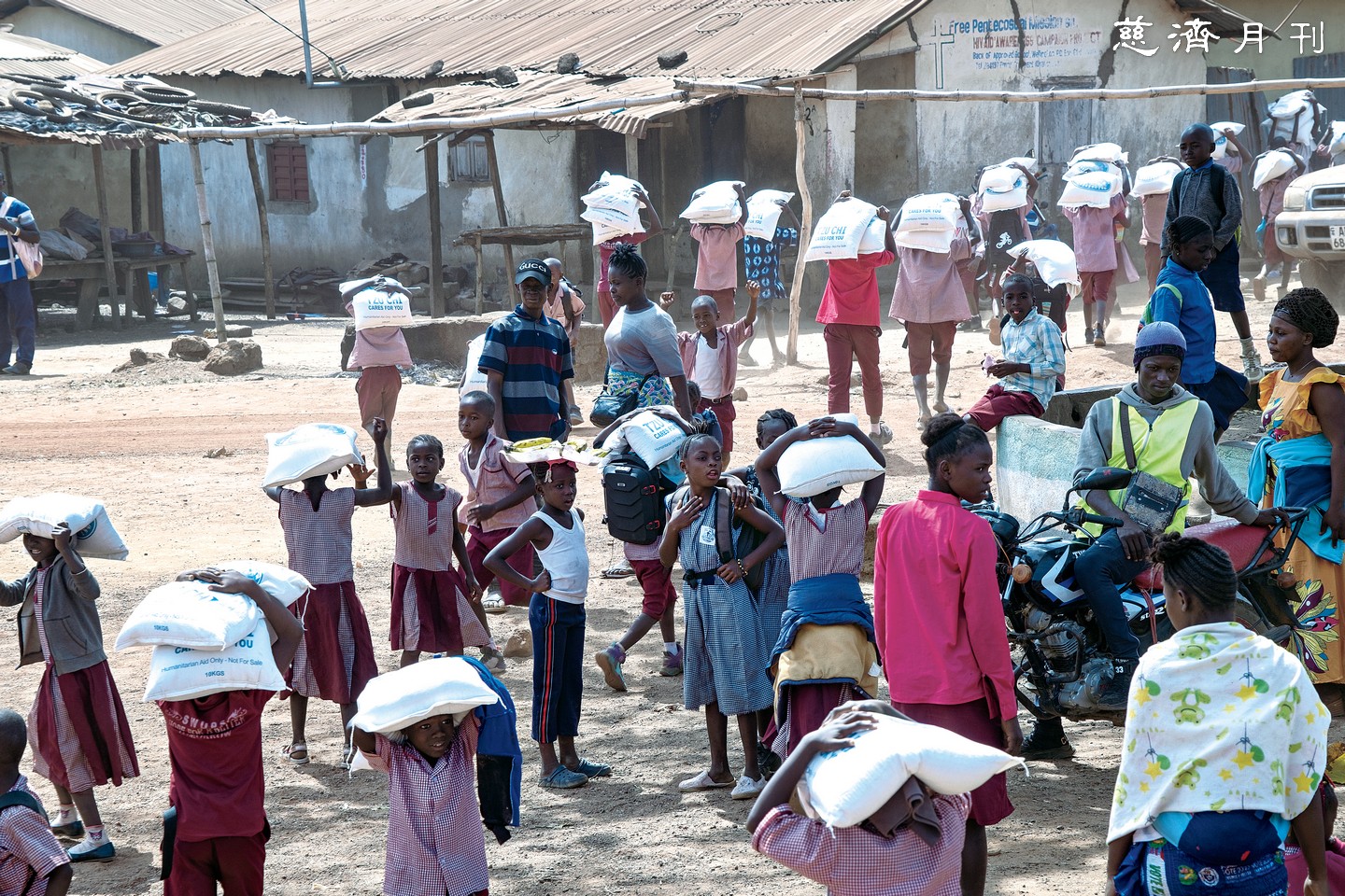 伊波拉疫情重災區科因杜小鎮,迄今仍在進行康復與重建;元月二十七日,「一起微笑小學」的孩子們頭頂大米,把慈濟捐贈的糧食扛進集會所。