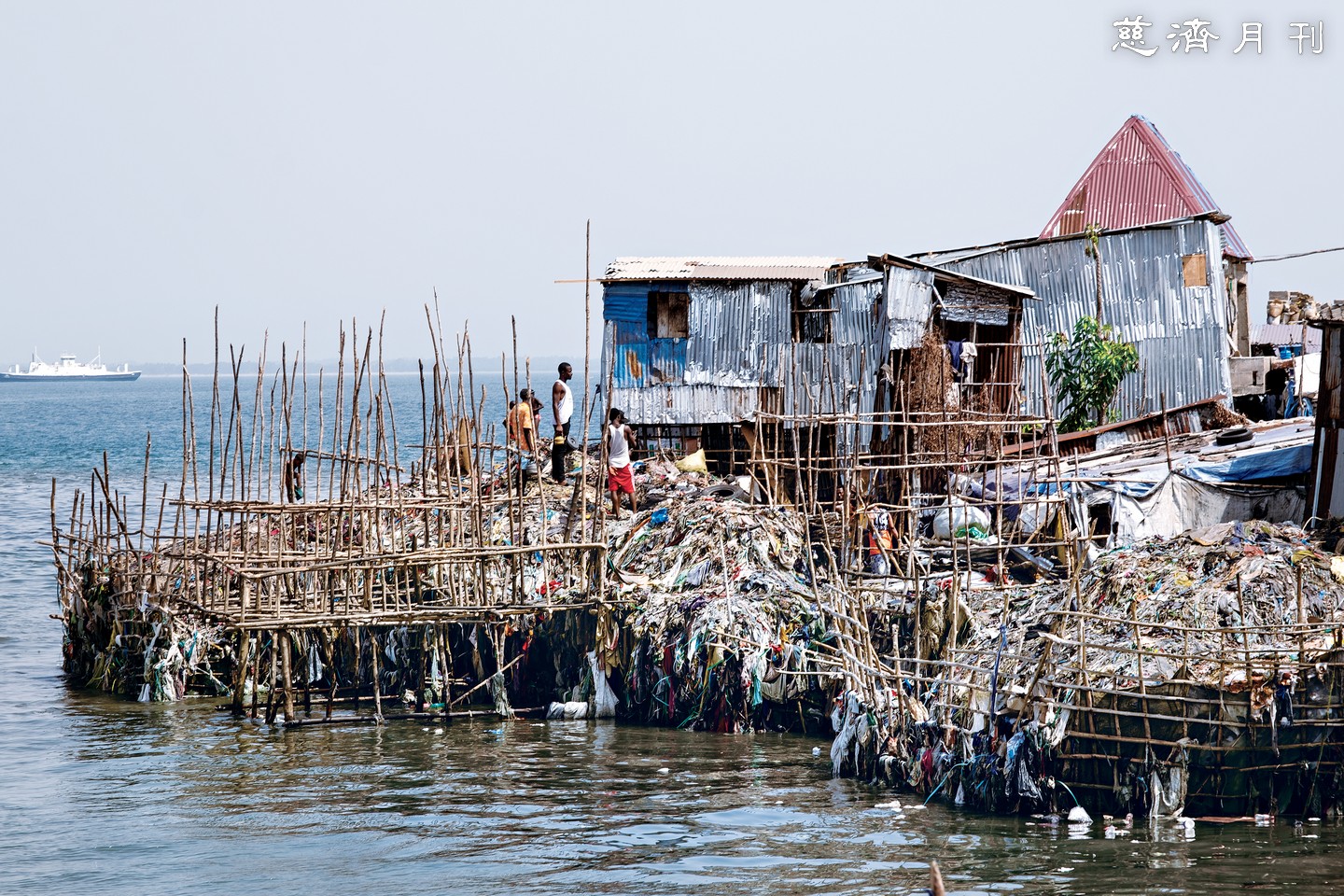 自由城蘇珊灣海岸邊,居民傾倒大量垃圾、廚餘、二手衣,混入石灰沙泥,再加上人力踩踏,久而久之形成「土地」,得以建房容納更多人遷入。河面架設柵欄,攔截上游沖刷而下的垃圾,也過濾出可回收變賣的物資。