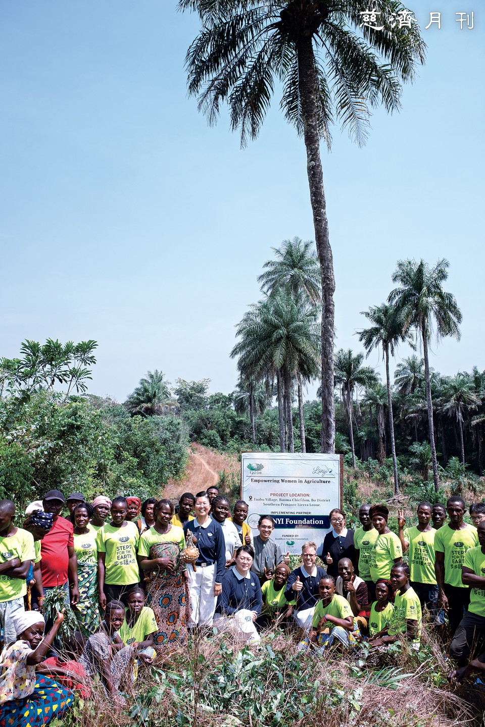 蘭頤基金會及慈濟基金會共同推動農耕計畫,增加糧食自給率;稻田前告示牌寫著「支持農村婦女發展(Empowering Women in Agriculture)」。
