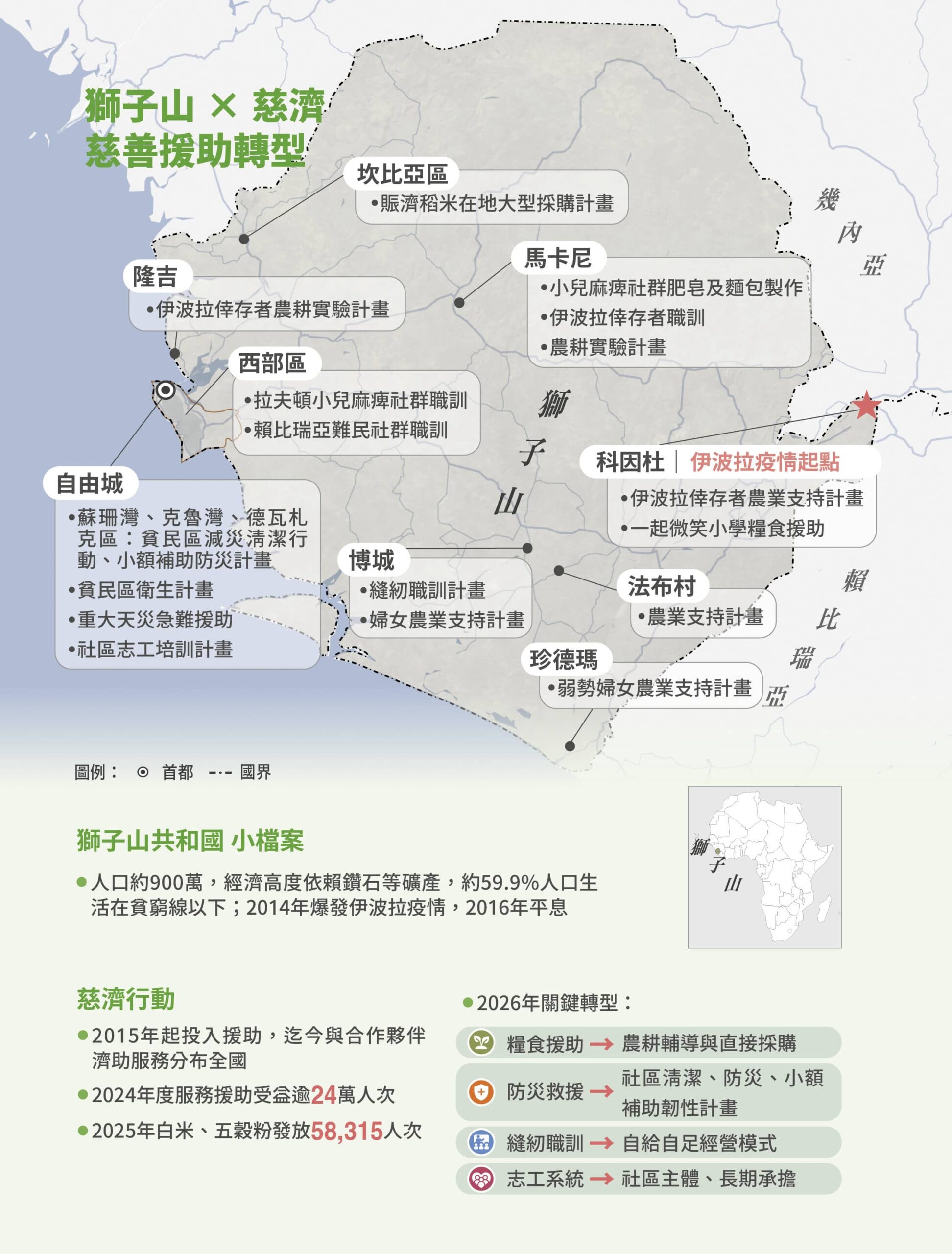 科因杜和首都自由城分別位於獅子山共和國東邊與西邊,相距約四百六十公里;十一年前慈濟深入伊波拉病毒倖存者社區援助,後續與自由城明愛會(Caritas International Freetown)、希利基金會(Healey International Relief Foundation)和蘭頤基金會(Lanyi Foundation)合作,把這條人道援助之路走得更廣更遠。
