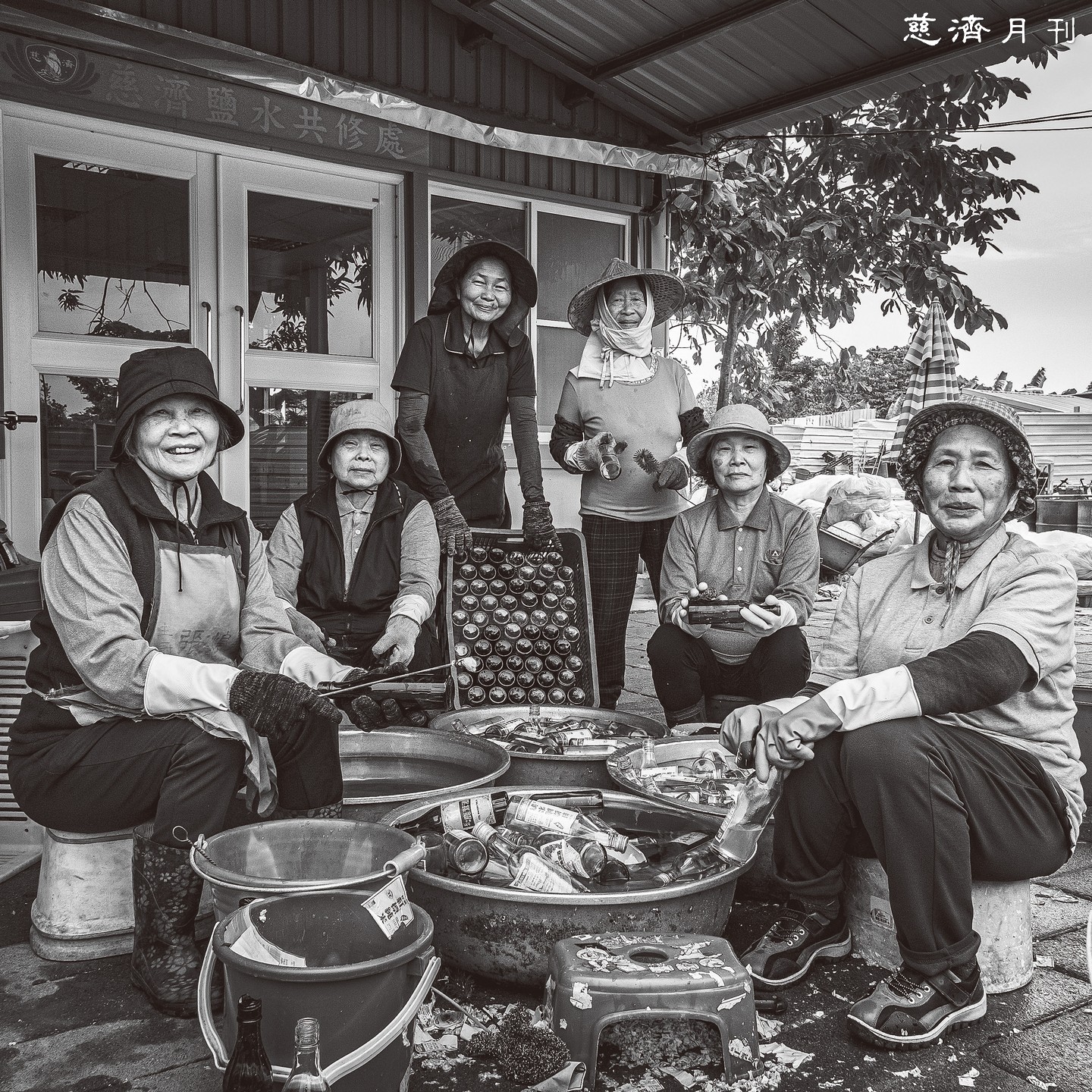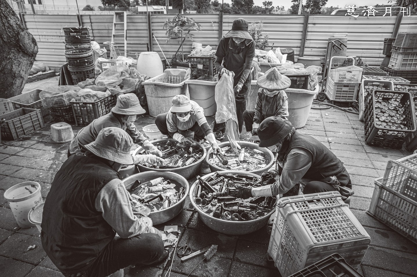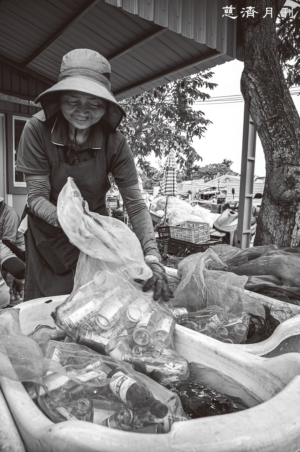 長年來,我走訪過不少環保站,見過各地處理資源回收的模式。猶記二○二二年九月,前往臺南鹽水環保站拍攝時,不經意發現一群婦女圍坐一旁,低著頭忙碌著什麼。我好奇走近一看,才知道她們正在清洗回收的玻璃瓶—這是我在其他地方從未見過的景象。