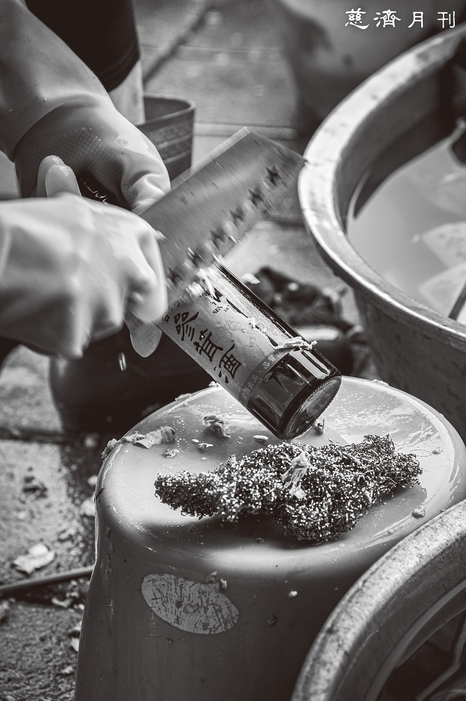 清晨不到七點,鹽水環保站裏已傳出清脆而響亮的玻璃碰撞聲。當我抵達時,一群婦女早在忙著清洗玻璃瓶。蘇秀香、黃寶秀、黃阿碧、翁碧月、吳碧利、李趙秀策等六位,是「洗瓶隊」的固定班底;她們的年齡恰巧都在七十歲以上,唯有六十八歲的蘇秀香最為年輕,因此主動扛起較為「沉重」的工作。每當環保站收回玻璃瓶,蘇秀香會先將瓶子分裝進網袋,再放入回收的大浴缸中浸泡至少一夜,讓瓶身的紙標籤與背膠充分軟化,好讓隔天的清洗作業更加順利。