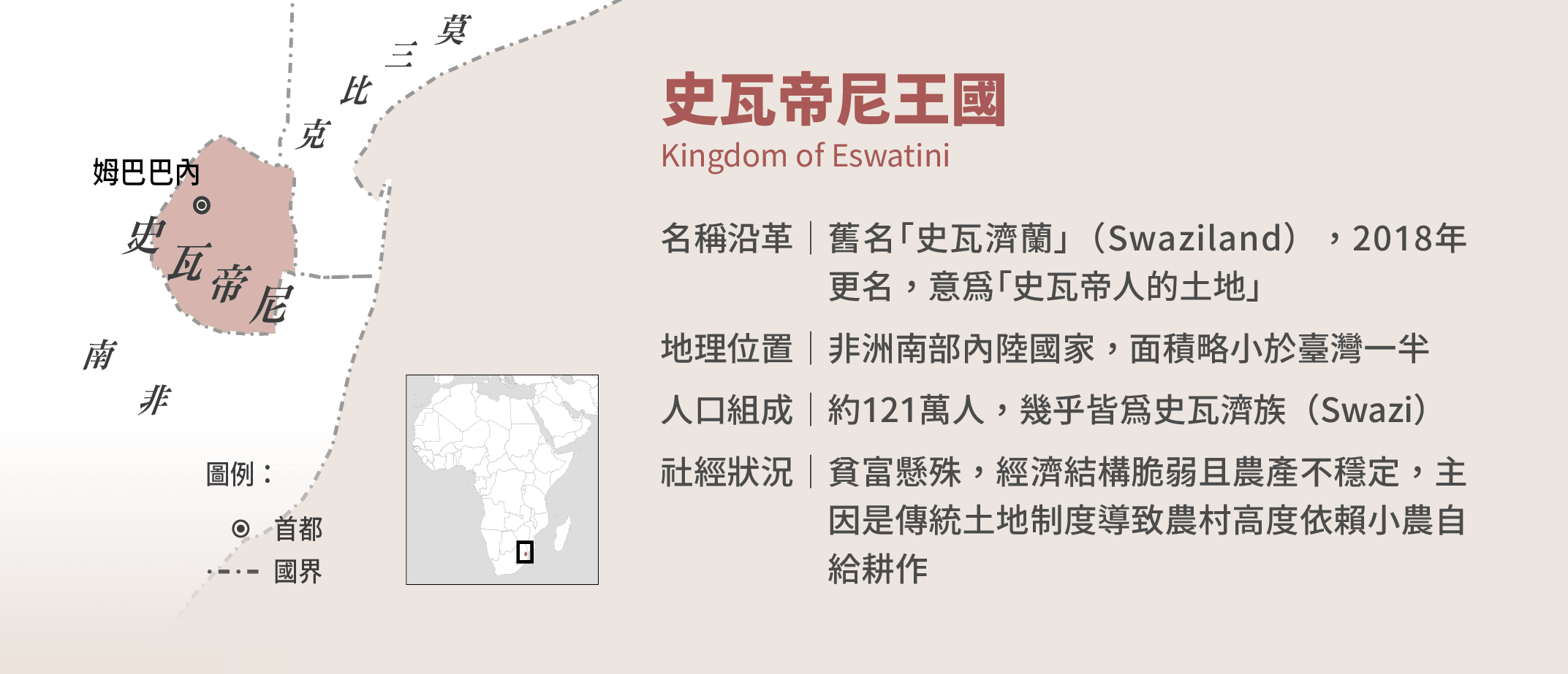 當飛機降落在恩史瓦帝國王三世國際機場(King Mswati III International Airport),雖然眼前一片漆黑,仍可感覺到機場的迷你。史瓦帝尼,這個迷你的王國,舊稱史瓦濟蘭,面積是非洲第二小國,僅臺灣一半大。南非慈濟志工潘明水曾打趣道:「在這個國家很容易碰到親戚。」