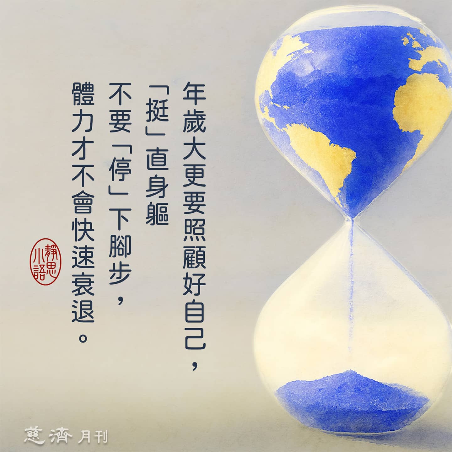 【靜思小語】年歲大更要照顧好自己,「挺」直身軀不要「停」下腳步,體力才不會快速衰退。