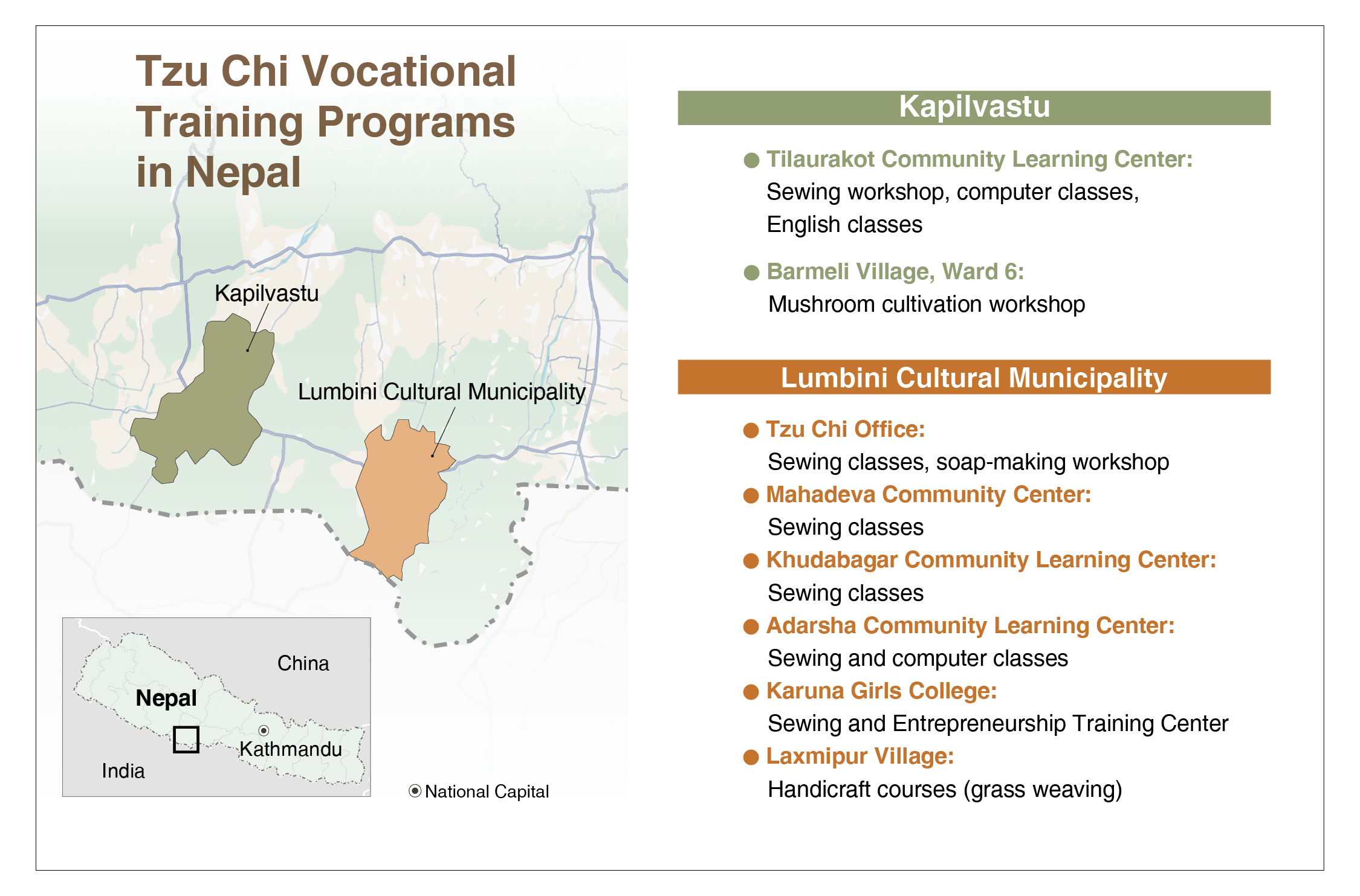 Tzu Chi volunteers have set up programs in Lumbini and Kapilvastu, Nepal, to teach valuable skills to women often restricted by caste and patriarchal norms. As sewing machines click, mushrooms flourish, and deft fingers weave handicrafts, these women are gaining a chance to rise out of poverty and become self-reliant.