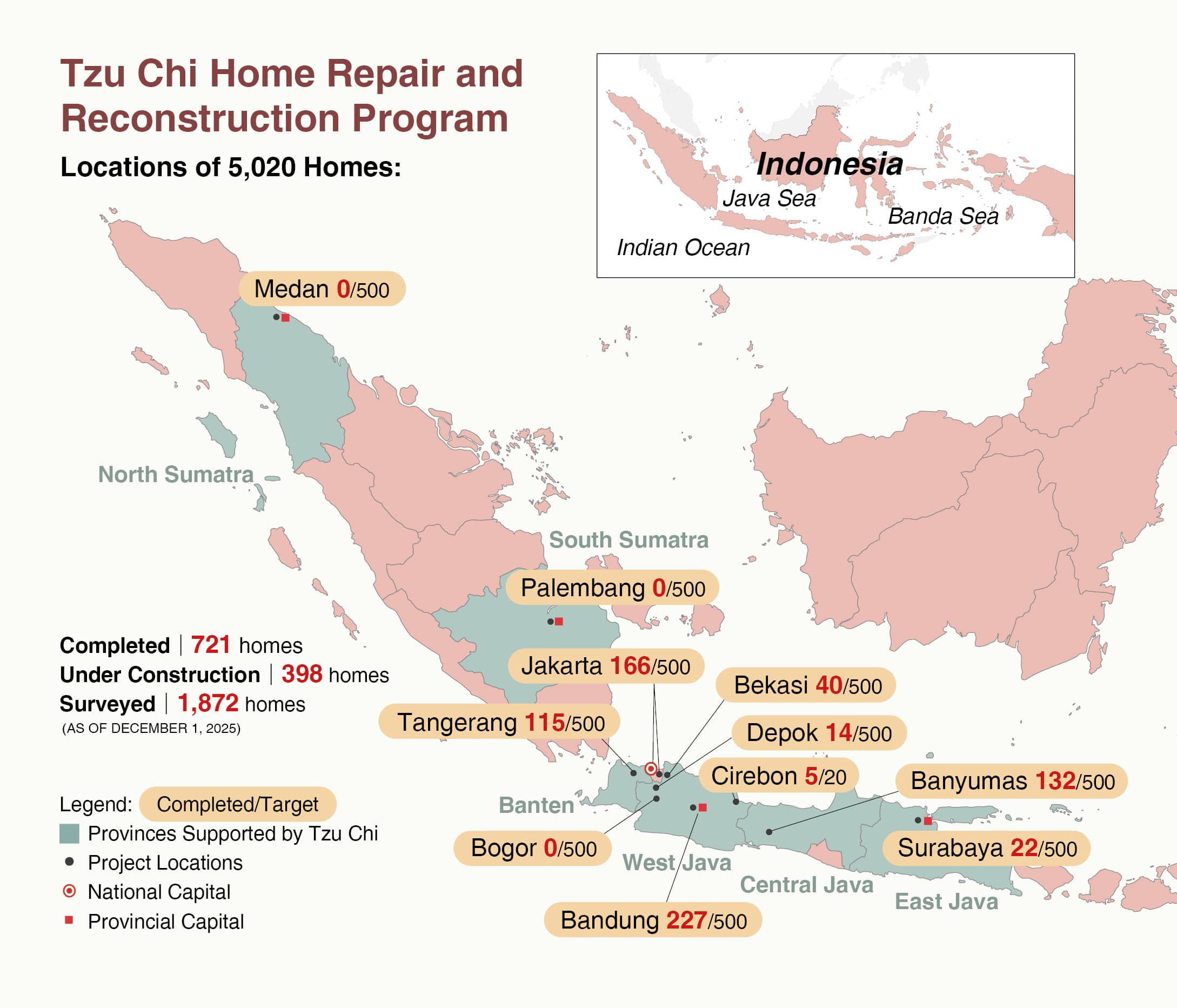 To achieve such objectives, Indonesia’s Ministry of Housing and Residential Areas has partnered with private companies and NGOs. Among them, Tzu Chi has committed to delivering 5,020 homes, making it the program’s largest partner. The foundation began work in January 2025 and completed over 700 homes by early December. Nearly 400 more are currently under construction.