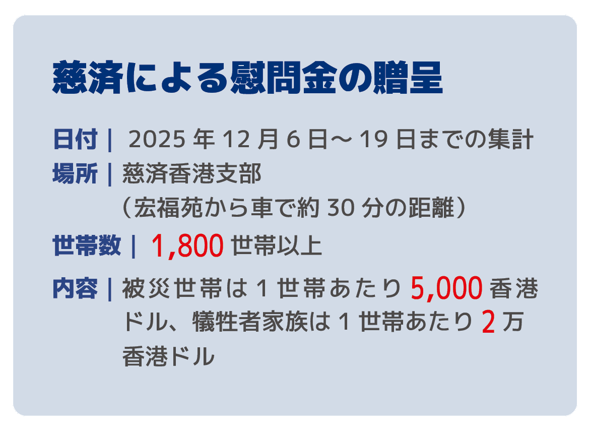 十一月二十九日、ボランティアは慈済の支援内容を公表した。その内容は、「十二月六日と七日に九龍塘にある慈済香港支部において、犠牲者家族には一世帯あたり二万香港ドル(約四十万円)、被災世帯には一世帯あたり五千香港ドル(約十万円)を贈呈すること。また、油麻地・彌敦道にある慈済大愛中医クリニックで、同日から十二月三十一日まで、被災者および最前線で救助に当たった人員に対し、無料で診療を行っている」等々である。