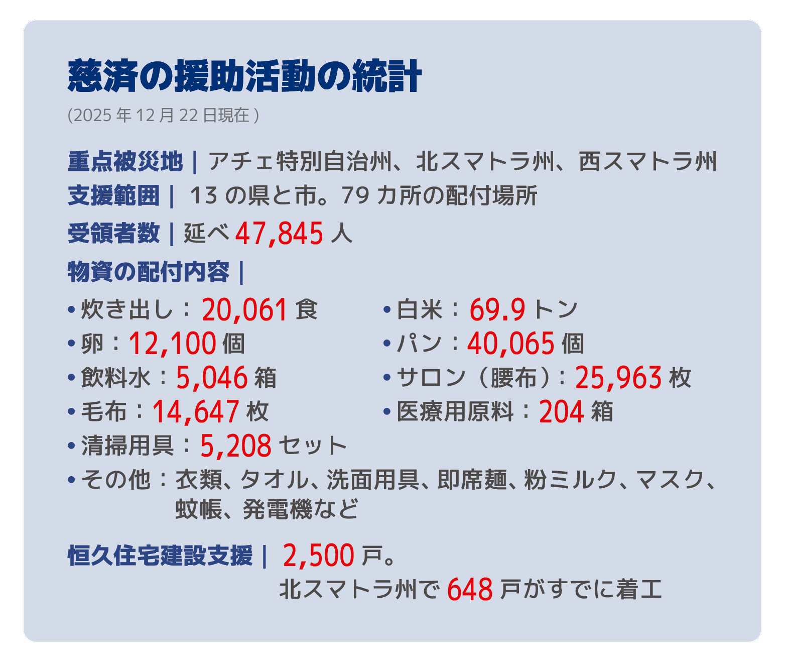 今回のサイクロンはアチェ特別行政区、北スマトラ州、西スマトラ州に甚大な被害をもたらした。インドネシア国家災害管理局(BNPB)の十二月中旬の統計によると、千二百人以上が死亡か行方不明となり、五十一万人が自宅から避難し、三百三十万人が影響を受けた。これは単なる数字ではなく、数百万人の生活が一瞬にして崩壊した現実を物語っている。