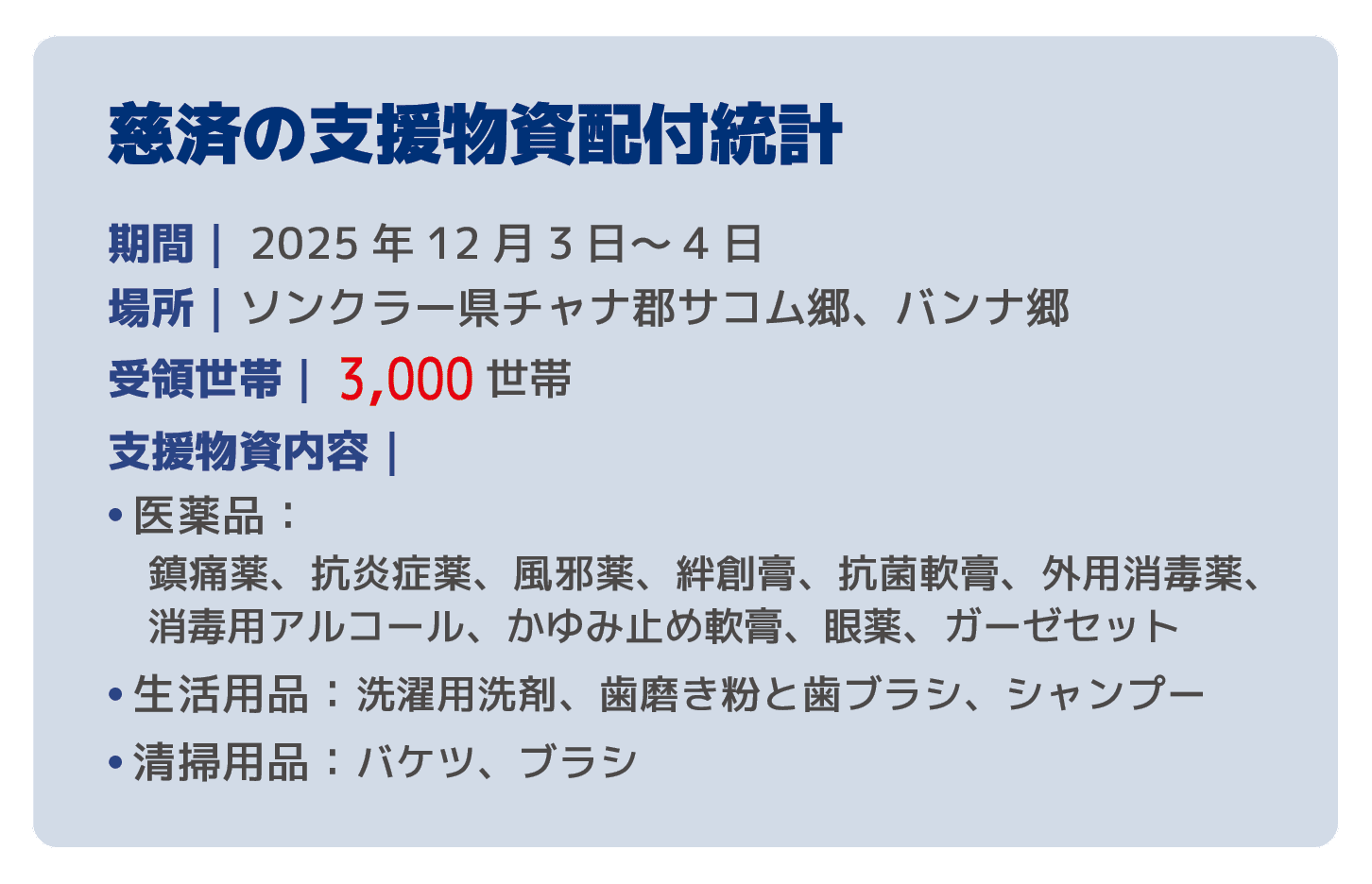 慈済タイ支部は、資源の乏しいジャナ郡に支援の重点を置いた。ボランティアたちは、解熱剤、抗炎症薬、風邪薬などの医薬品、及び生活用品と清掃用品の調達に奔走した。十二月一日と二日には、バンコクの静思堂で三千人分の物資を梱包し、それを載せて、六輪トラックが千キロの陸路を十五時間かけて走破し、やっとジャナ郡に到着した。