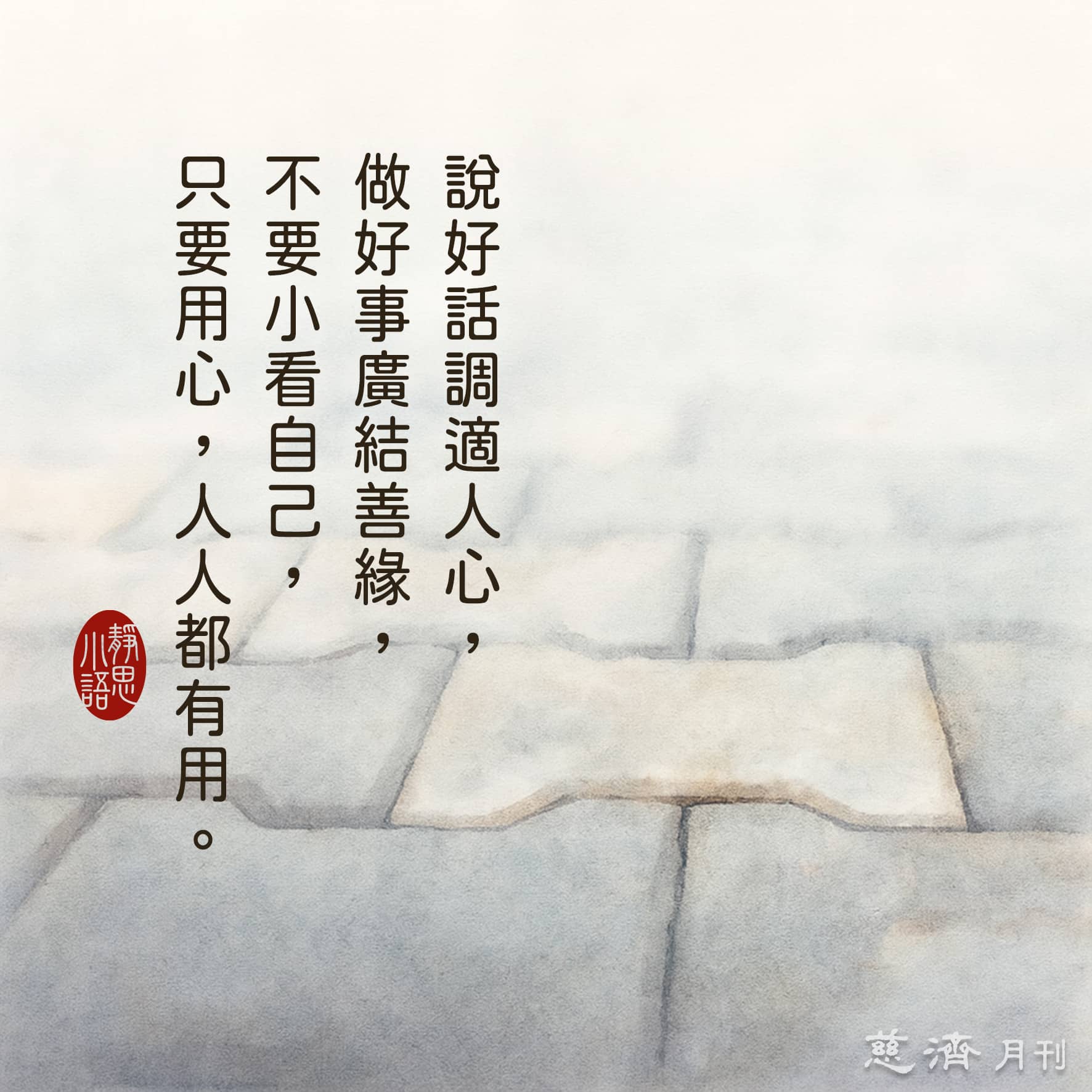 【靜思小語】說好話調適人心,做好事廣結善緣,不要小看自己,只要用心,人人都有用。