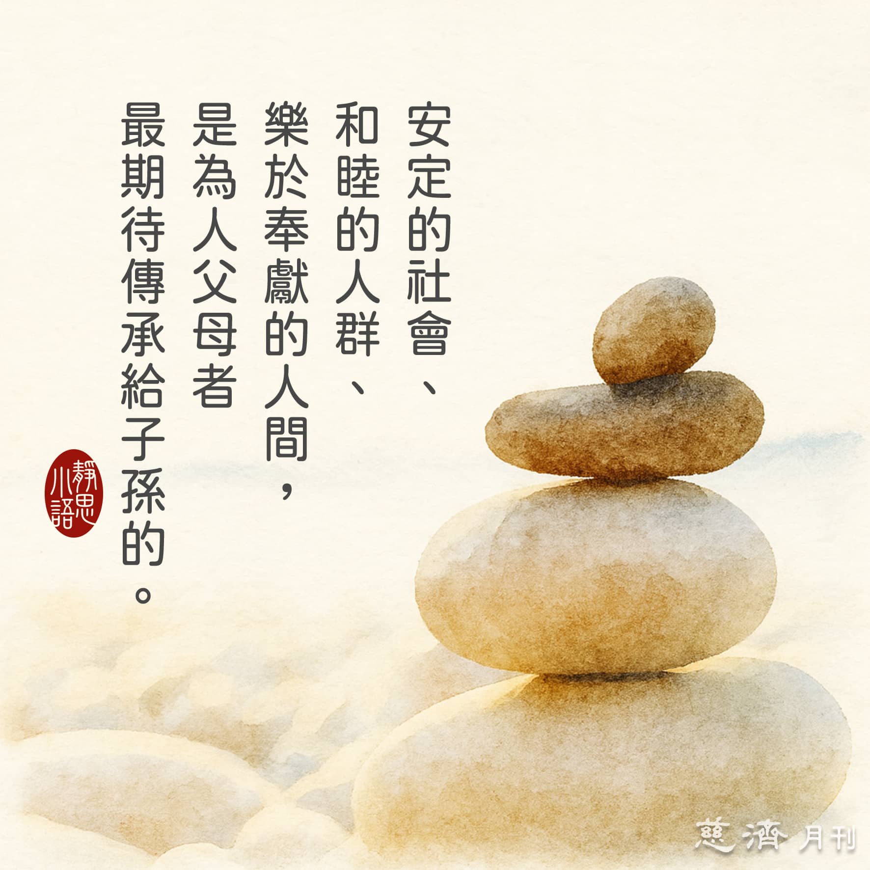 【靜思小語】安定的社會、和睦的人群、樂於奉獻的人間,是為人父母者最期待傳承給子孫的。