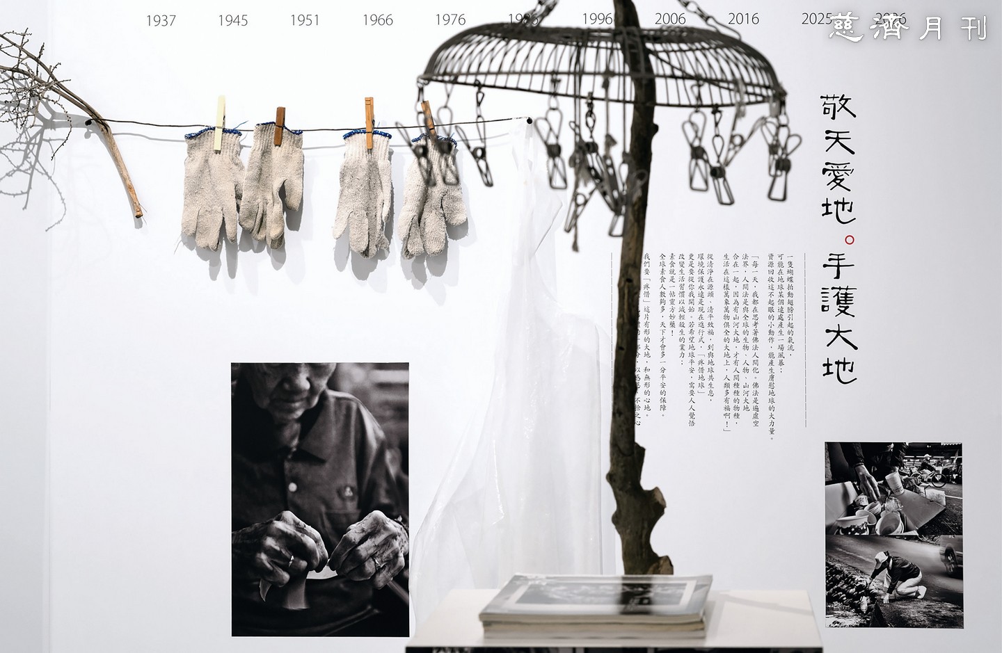 展場一隅,以環保志工的布手套與回收風扇網製作吊衣架,樸實呈現惜物愛物、克儉生活的精神,也讓訪客在細節中留下深刻感動。